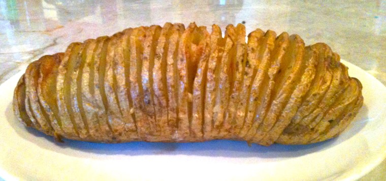 Combine all remaining ingredients. Using a butter knife, spread the mixture in between each slit. Rub the remaining mixture on the skin of the potato.