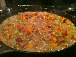 Back to the vegetables. Stir in the flour to evenly coat the veggies. Cook out the raw flour taste, about 2 minutes.