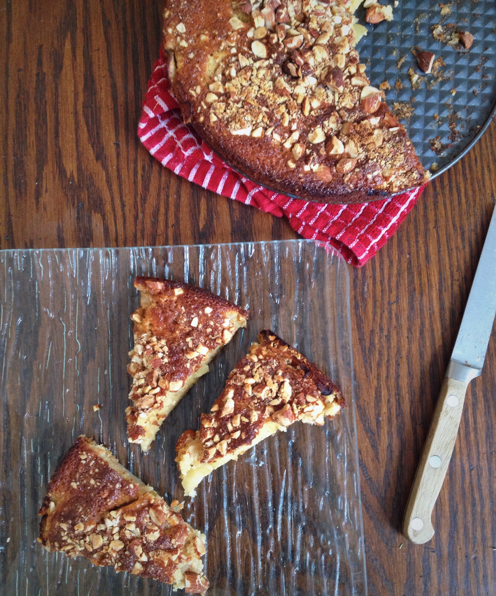 Combine almonds, cinnamon, and ginger, and sprinkle evenly over the cake. Bake for about 40 minutes, until a toothpick comes out clean. I don’t blame you if you dig right in, but cooling it slightly means it will cut a little cleaner. Yum!