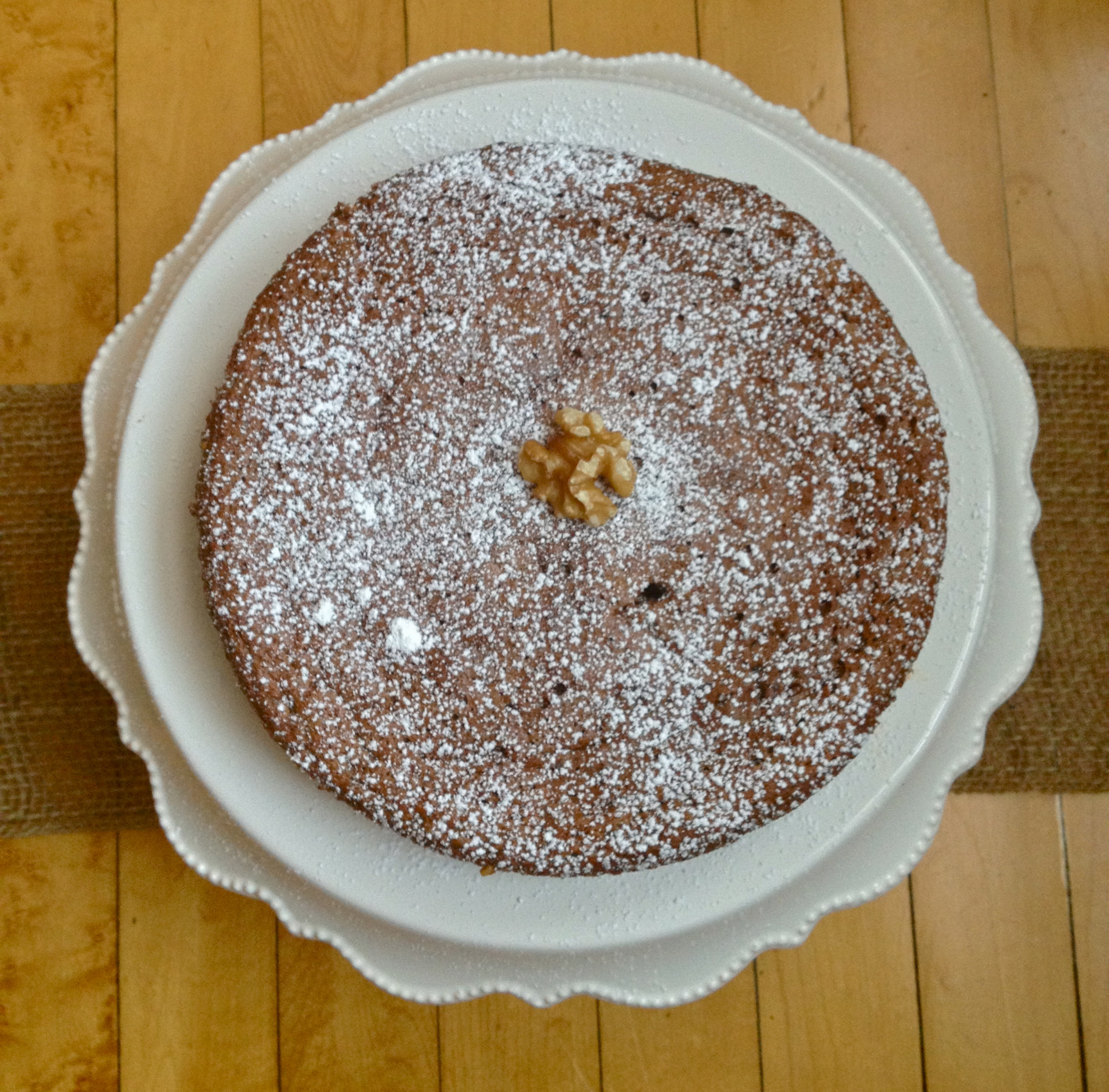 Remove the cooled cake from the pan. Sprinkle with powdered sugar and garnish with another walnut or two. Lovely!