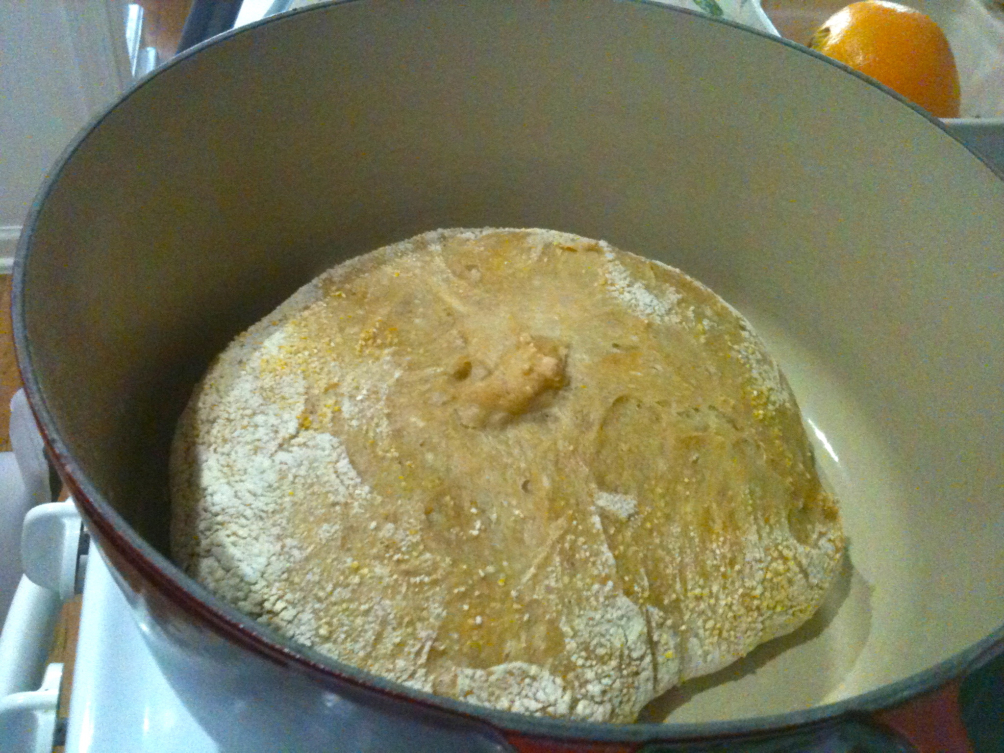 Just before 2 hours is up, preheat oven to 450 F with Dutch oven or bread pan inside to heat. The dough ball will have more than doubled in size.