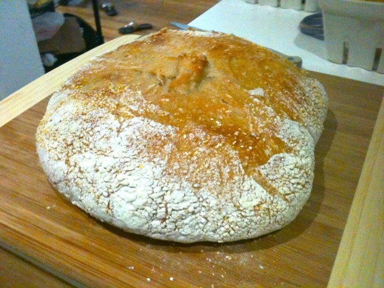 After 30 minutes have passed, remove lid and let bread finish baking uncovered, about 20 minutes, until nicely browned.
