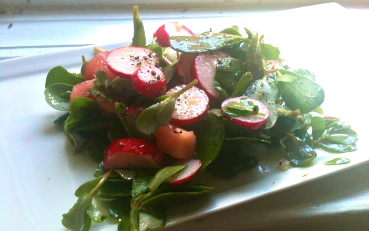 The farmers market had some beautiful watercress and radishes on Saturday, so I picked up a few bunches of each, content in the knowledge that a yummy salad was in my future. Most of the time, I’m not a salad fan–or more accurately, not a lettuce fan. I’ve found that the salads in my life fall into two categories: boring or bad for you. That’s why, when I think of a salad like this one, which is neither boring nor bad for you, I get really excited and have to share it!
