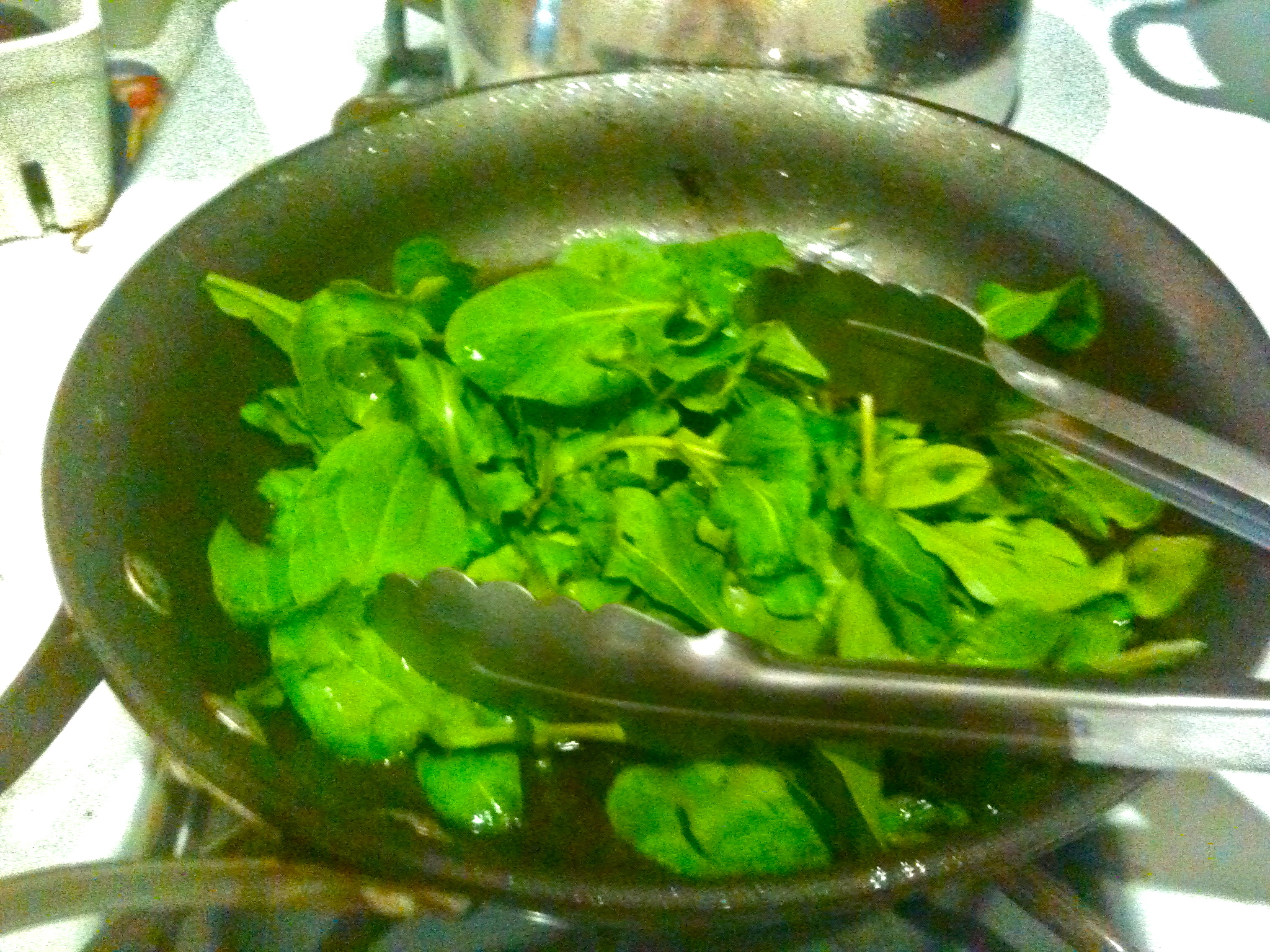 Then add enough olive oil to the pan to make a dressing for the arugula and stir. Remove from heat.