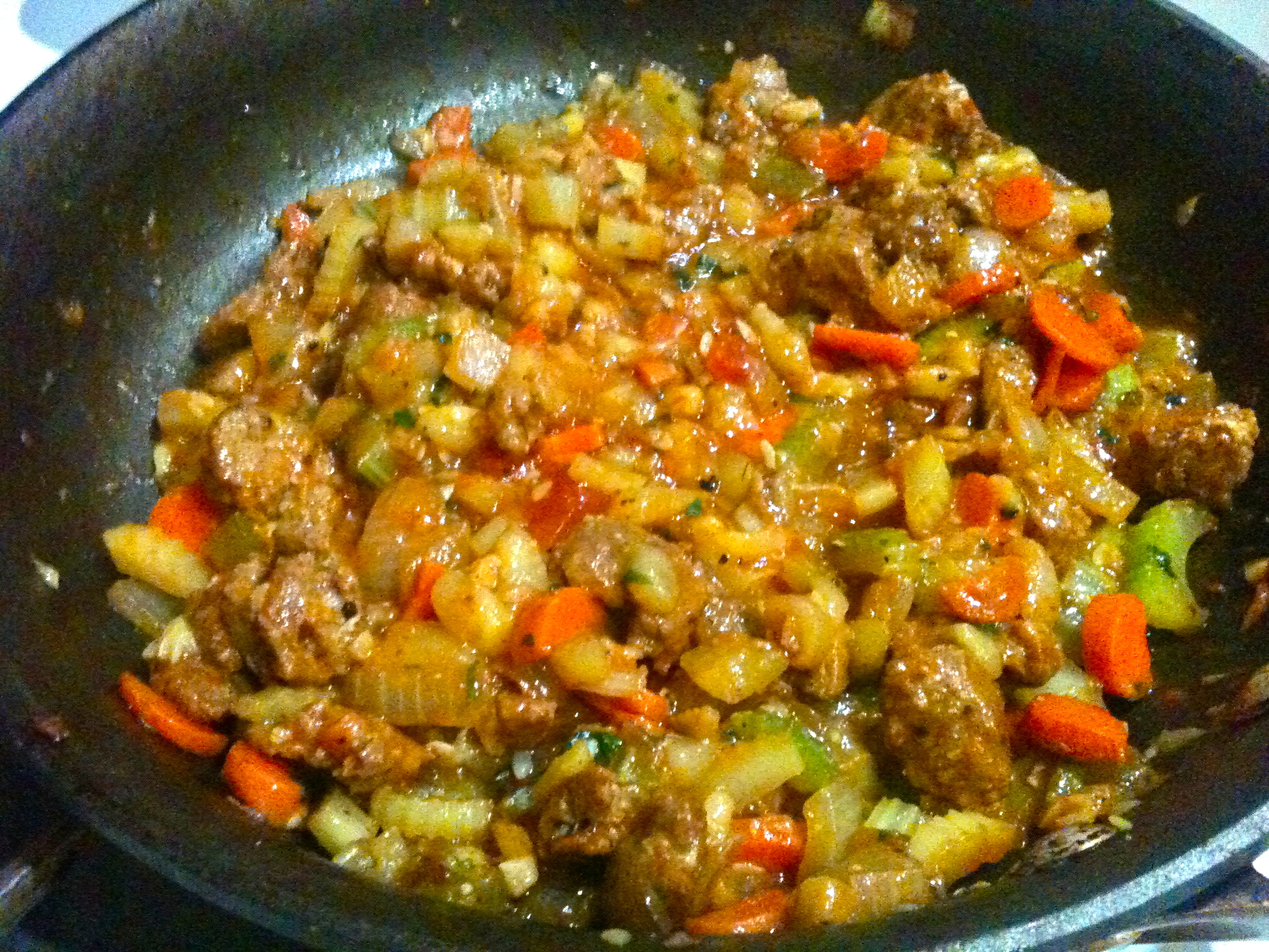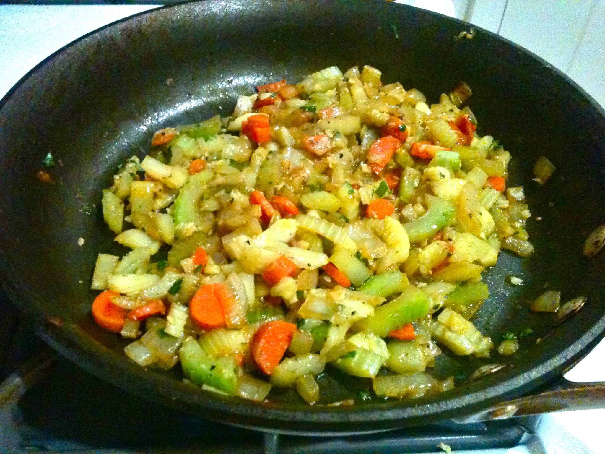 Add the celery, carrot, and onion to the pan with the chorizo juices and cook until soft.