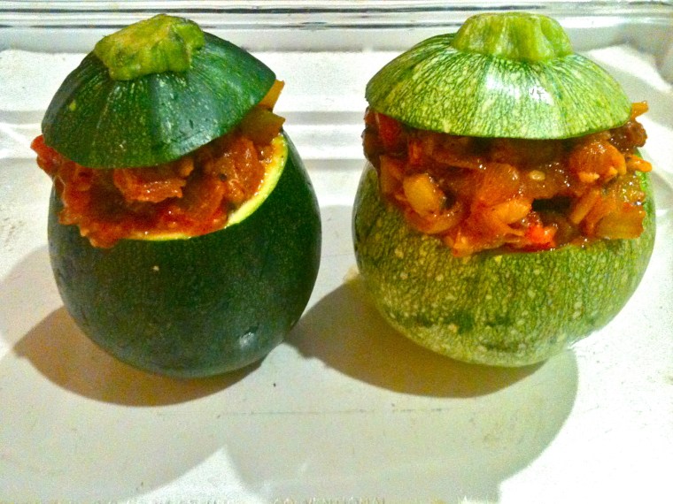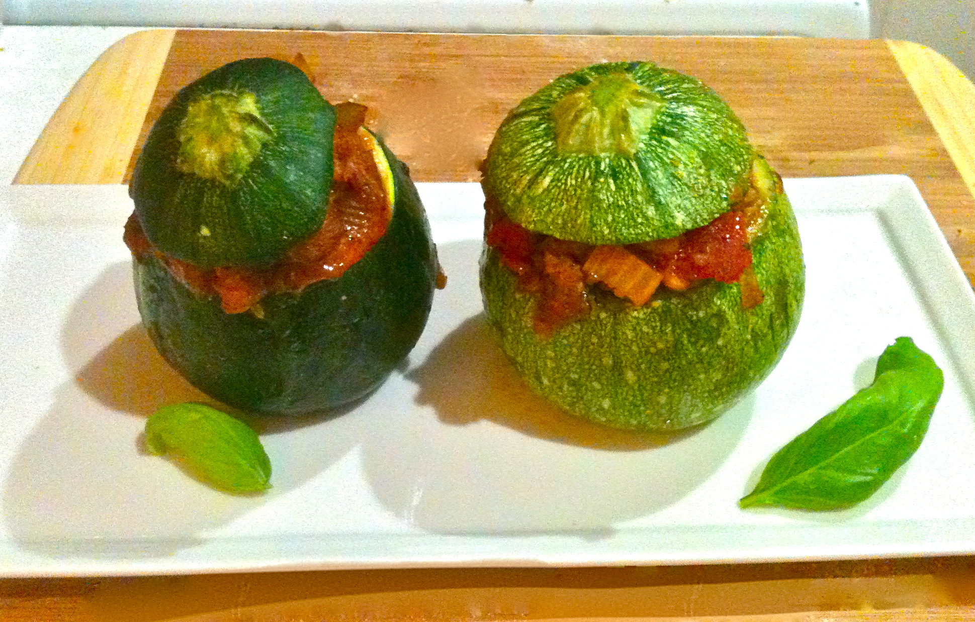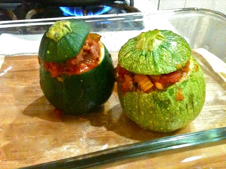 Recently I feel like I’ve been seeing eight ball zucchini everywhere! I guess that could be explained by the fact that they’re in season right now…but still. I noticed that a bunch of bloggers had interesting stuffed zucchini recipes to offer; then these pudgy little guys appeared on my roommate’s dad’s wedding menu 2 weeks ago, and (as if it weren’t a sign from the universe that I should give them a try myself), they were at my farmers market on Saturday. So I picked up a few. First of all, they’re adorable. Second, they’re so versatile! I love how they leave so much room for food-creativity. I just kind of made this dish up as I went along, and you can can do the same–just prepare them using whatever you’ve got hanging around your kitchen and these will come out beautifully!