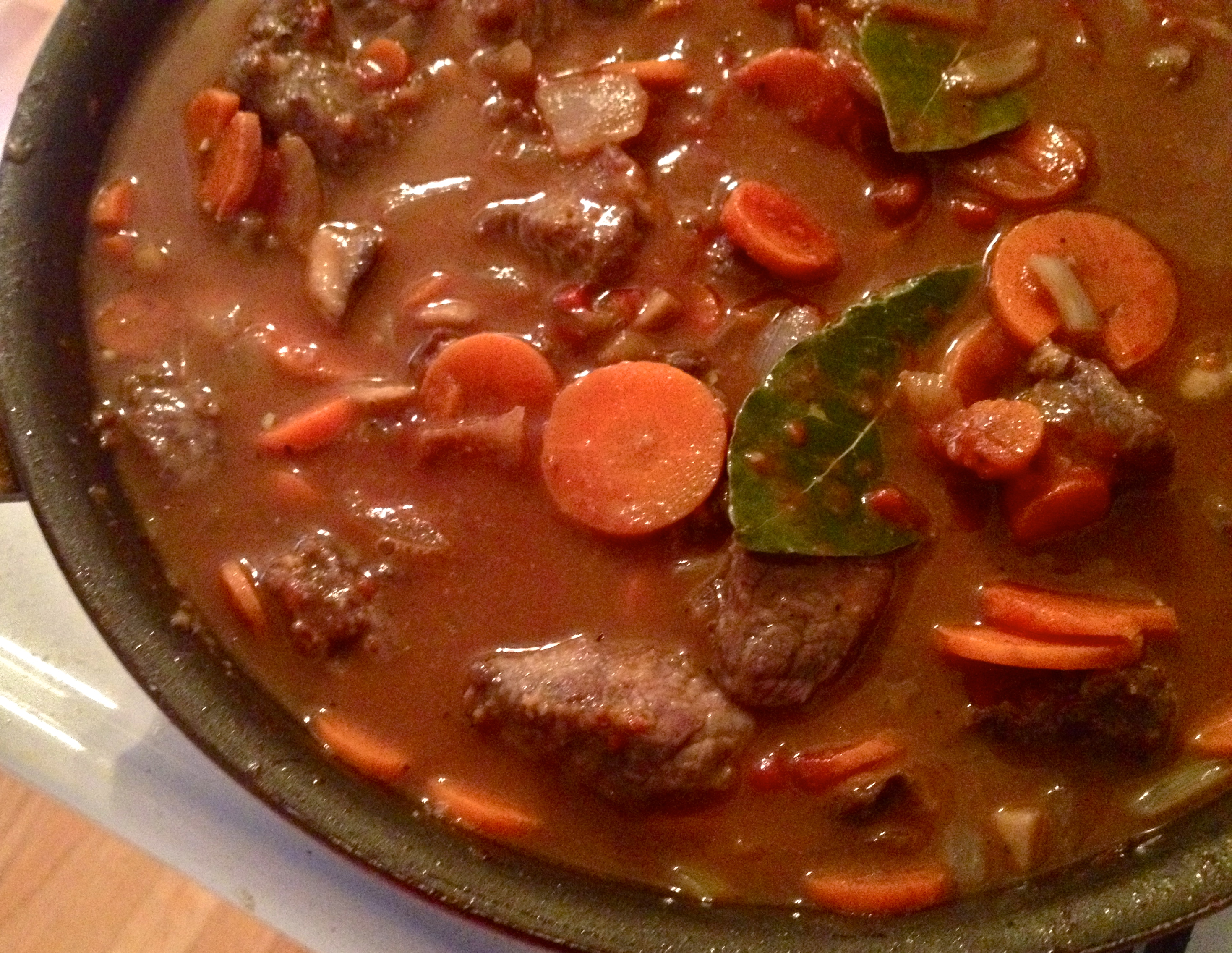 Add more oil to the pan and add the carrot and onion, with a sprinkle of salt. Cook until softened, then add the mushrooms and cook an additional 5-7 minutes. Add the beef back to the pan with the tomato paste, bay leaves, wine, stock, and curry powder. Stir well, bring to a boil, and then cover and turn down to a simmer. Cook until the beef is fall-apart tender, at least 2 hours.