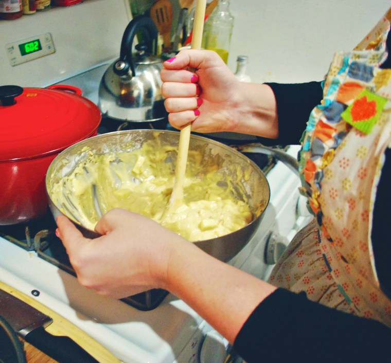 Use the handle end of your spoon to swirl the cinnamon into the top of the batter.
