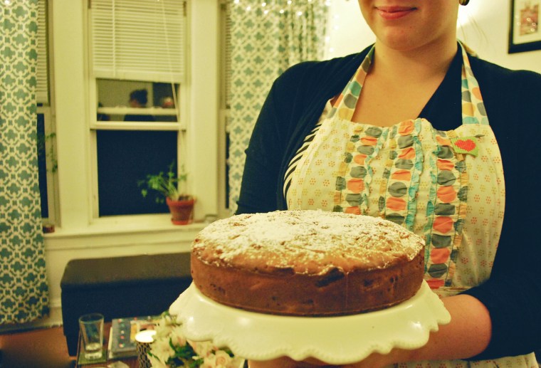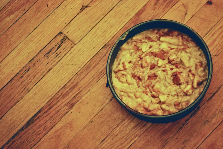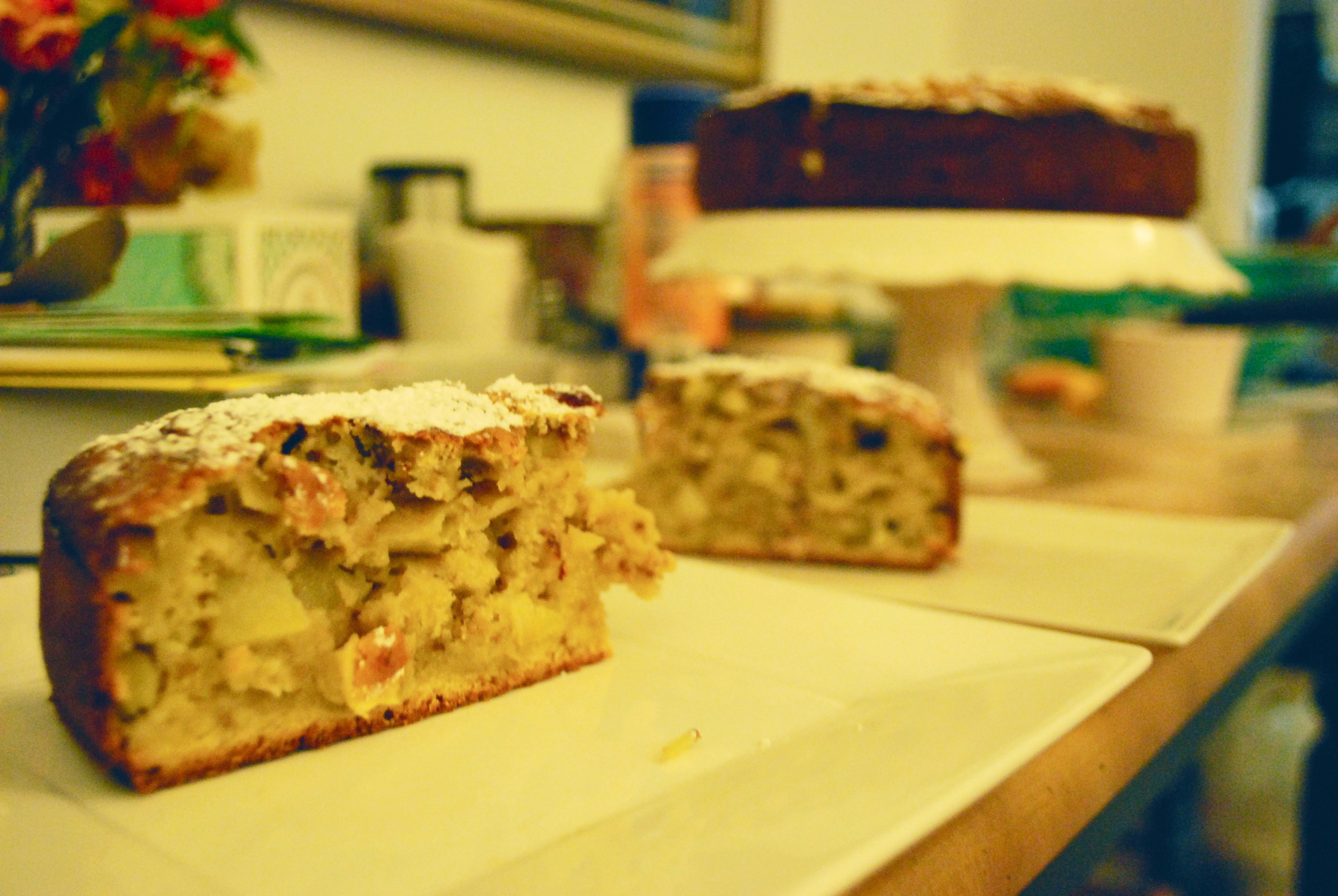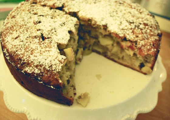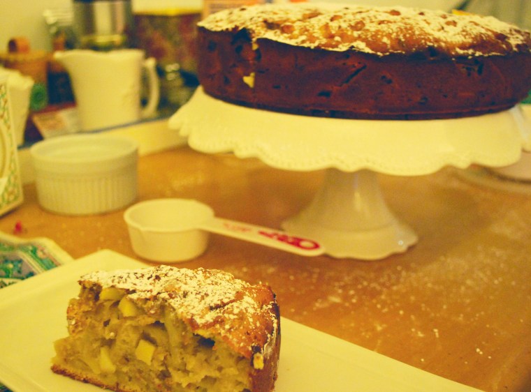 Many many thanks to fantastic art director and mi amiga Vanessa Palacio for photographing this cake for me! These are by far the most expert and mouth-wateringly gorgeous shots that have graced KellyintheKitchen. And not only that, but she also picked the apples herself on a recent apple orchard excursion, so muchas muchas gracias a ti, Vane!! We got together on Sunday at my apartment to bake this yummy apple walnut cake, inspired by a similar recipe from smitten kitchen. It’s a pretty unique cake—we loved that instead of butter, this recipe calls for olive oil and lemon-flavored yogurt, which really changes the texture and makes it super moist and soft. After all our hard cake-prep work, it was quite a struggle waiting for our pastel de manzanas y nogales to finish baking, but once it was done (and had posed for its close-up), each bite was everything we dreamed of and more. Nos gusta comer manzanas.