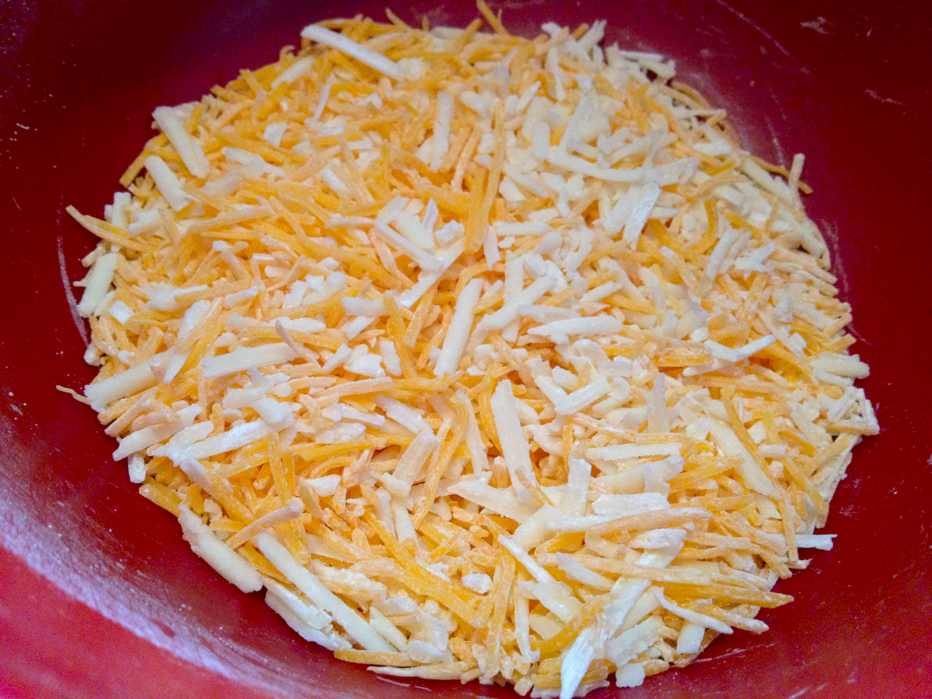 Meanwhile, put the cheddar in a bowl and toss it with the corn starch, mustard powder, and paprika (we had a brick of yellow cheddar about to run out, and then we started a new brick of white cheddar; hence the yellow and white. In mac and cheese as in life, color doesn’t matter).
