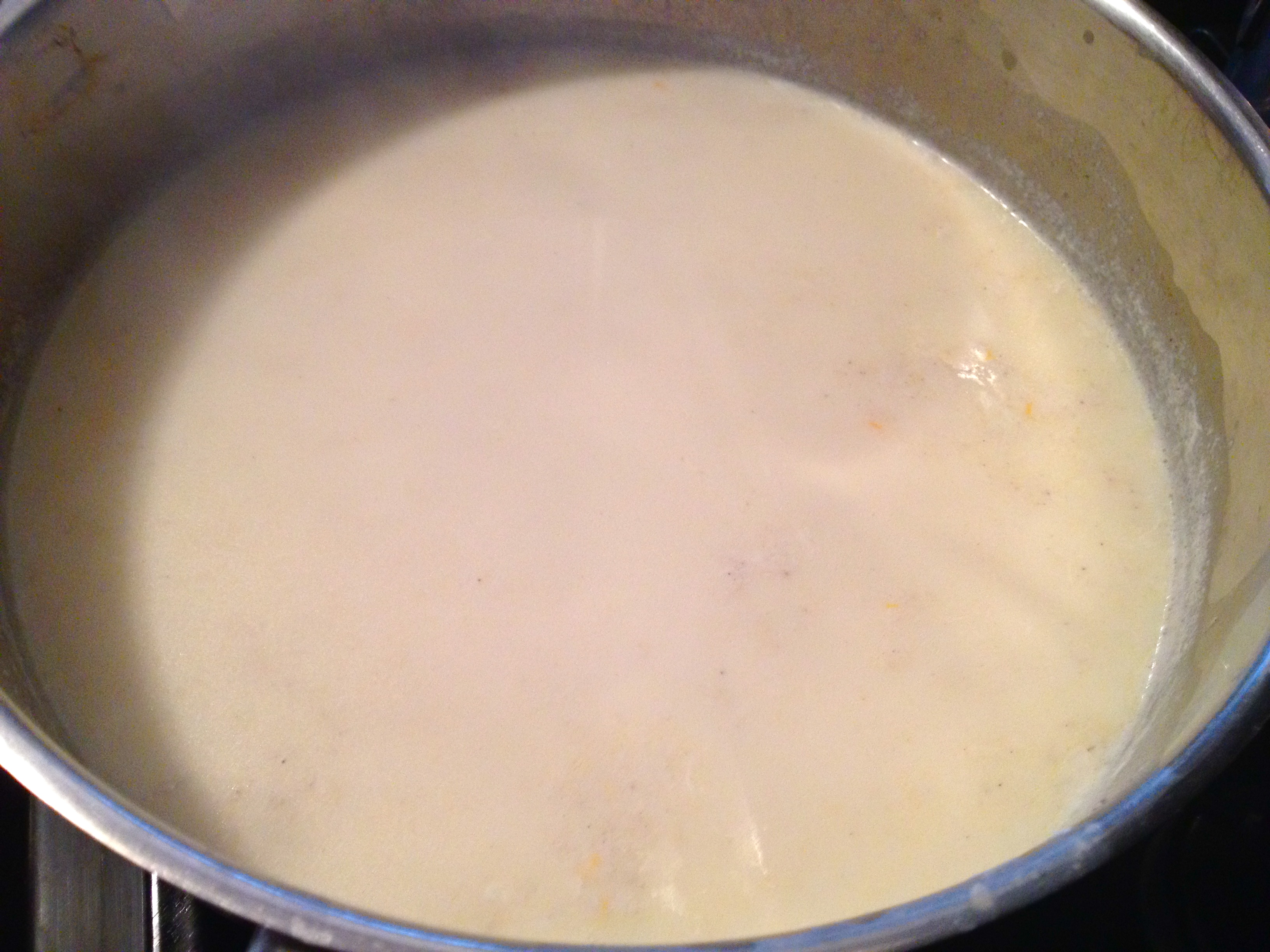 Now, the cheese sauce. In a large saucepan that’ll be big enough to hold all the pasta, heat the milk, stock, and bay leaves and simmer for 5 minutes.