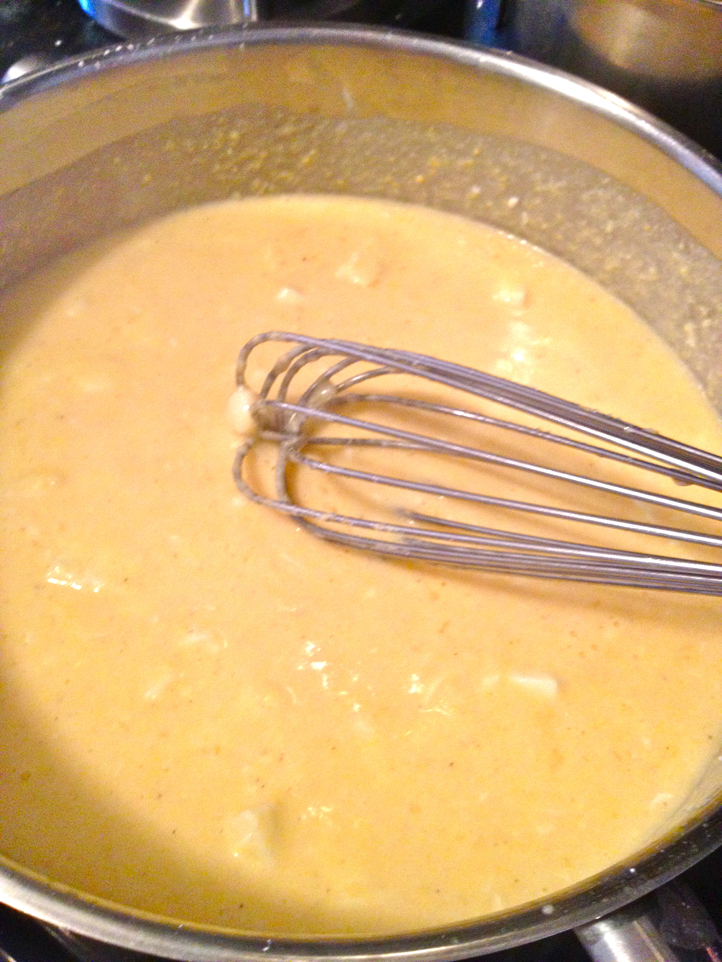 Then remove the bay leaves from the milk and stir in the cheddar. Turn the heat down to low, stirring as the sauce thickens, about 10 minutes.