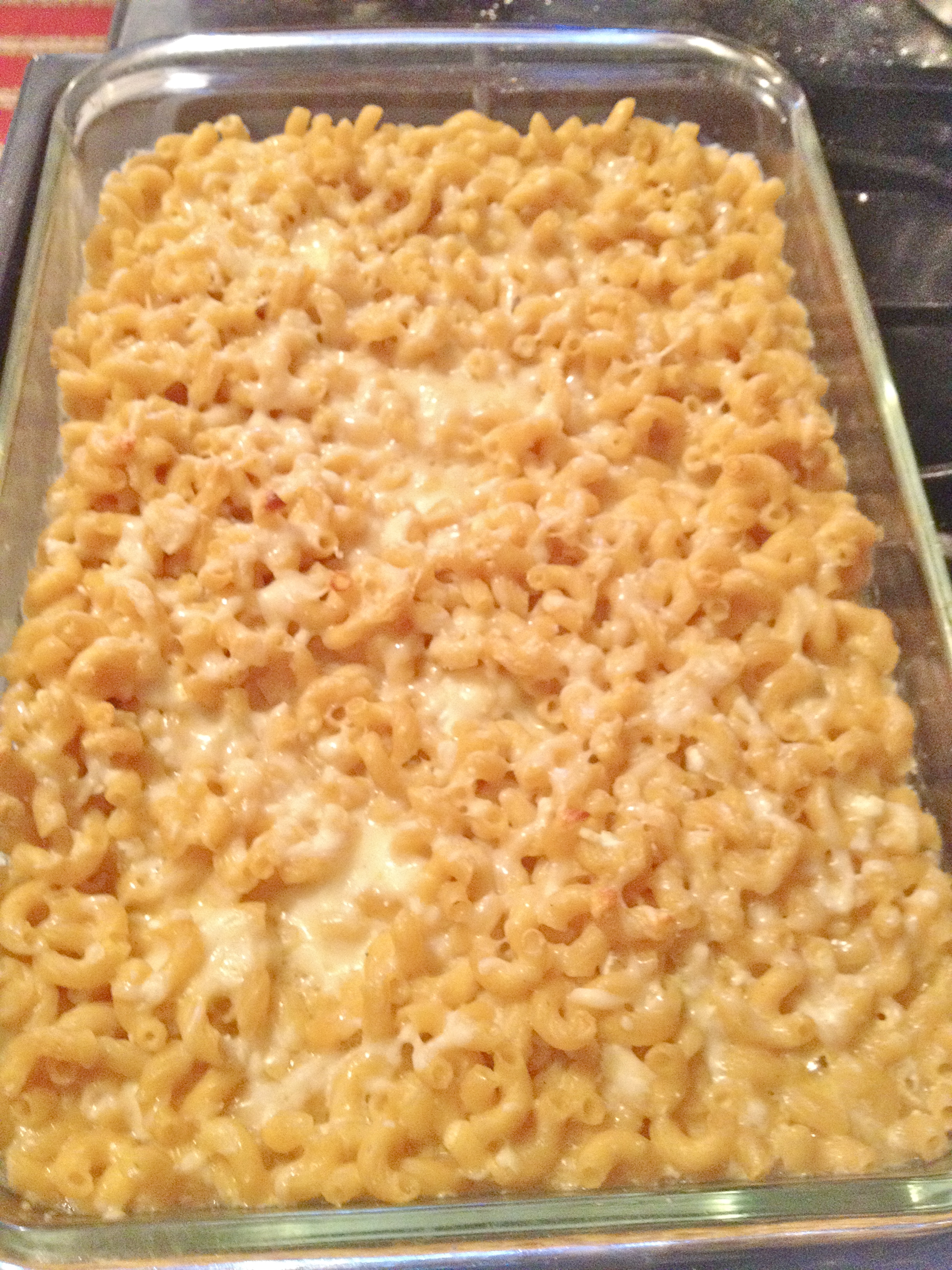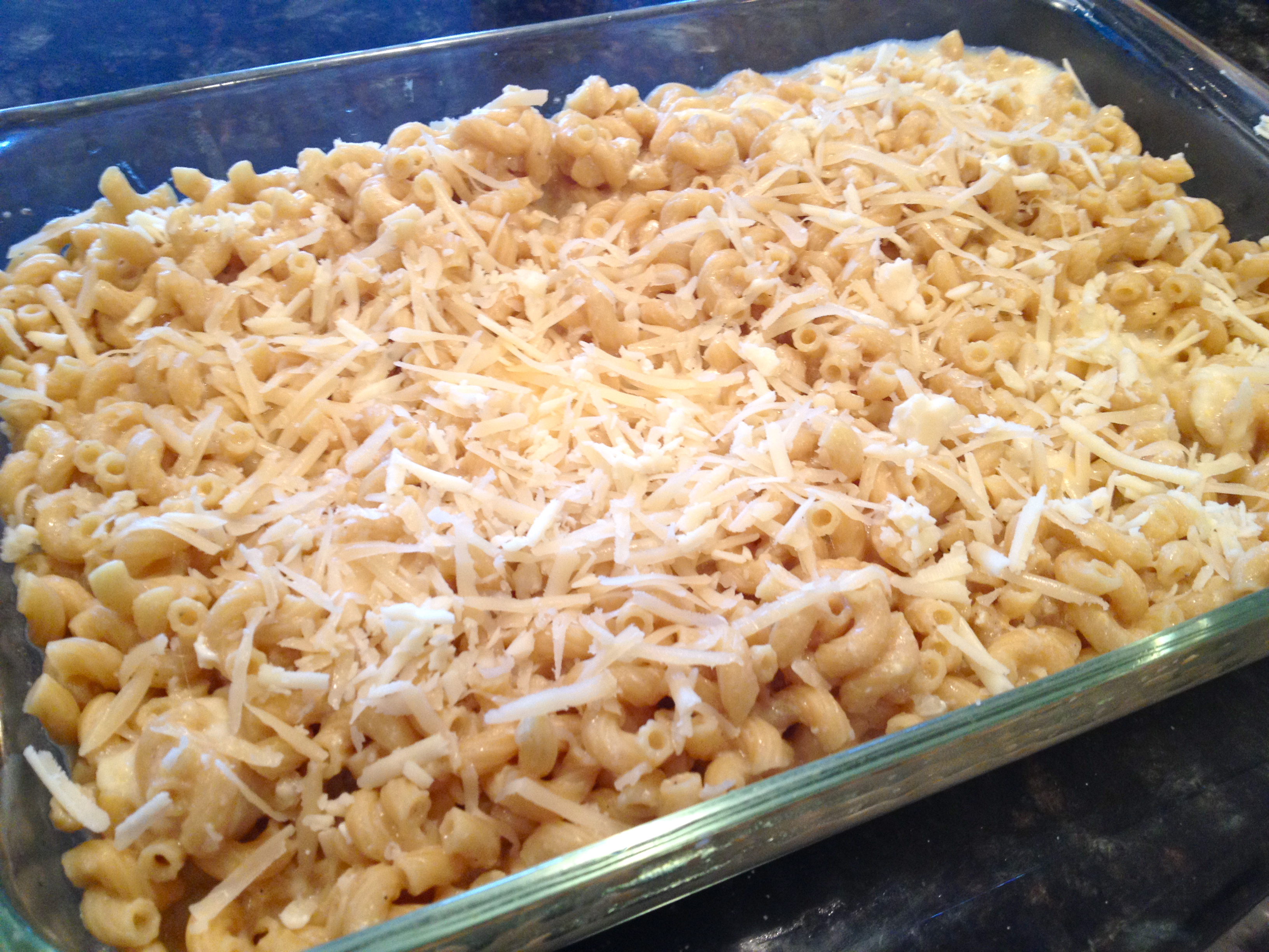 Toss the pasta in the sauce to coat, and then pour into a greased baking dish. Sprinkle with a handful of cheddar and/or parmesan, if you like.