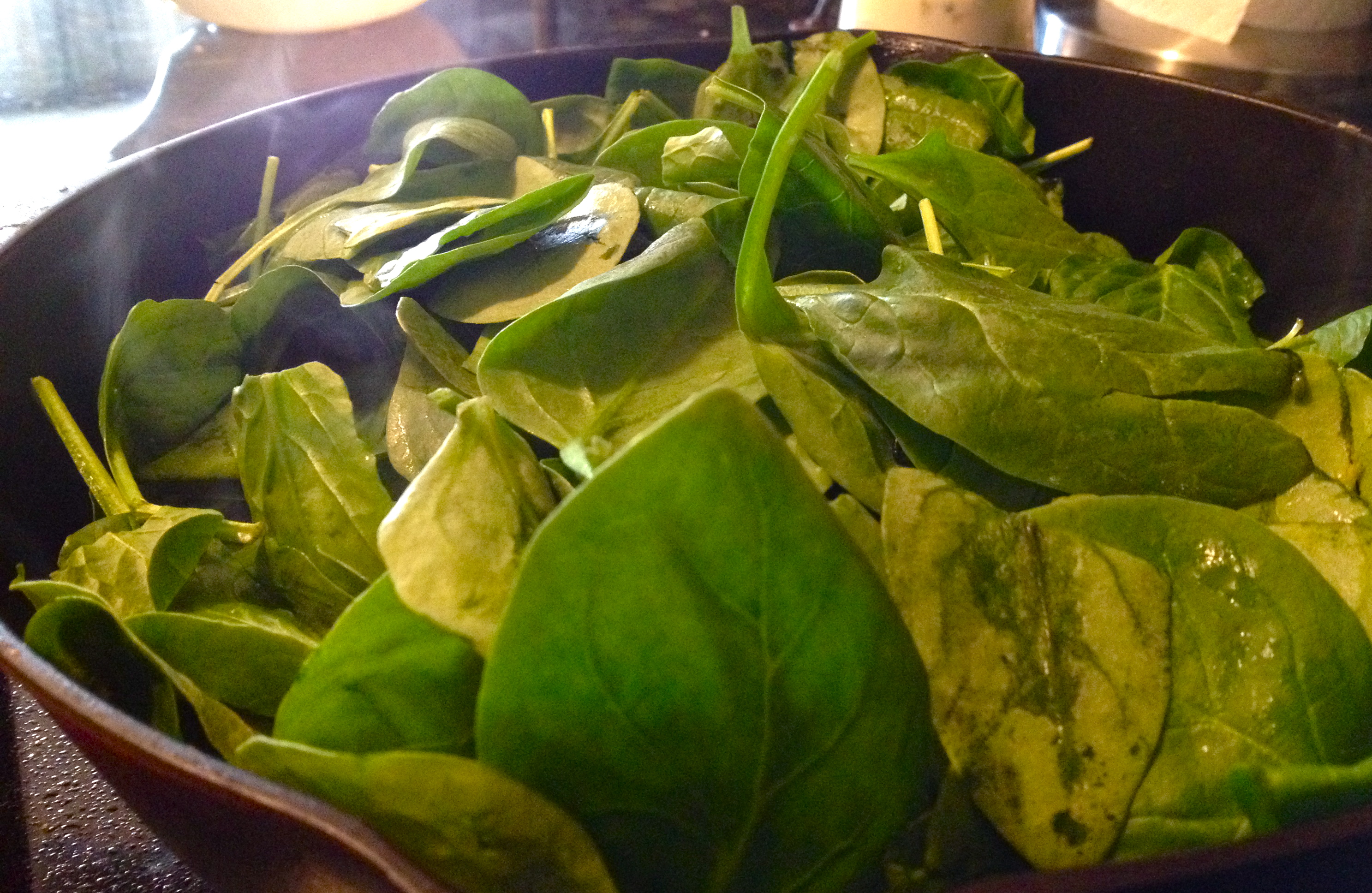 Cook the spinach, stirring, until nearly wilted. Turn off the heat and continue to stir until completely wilted.