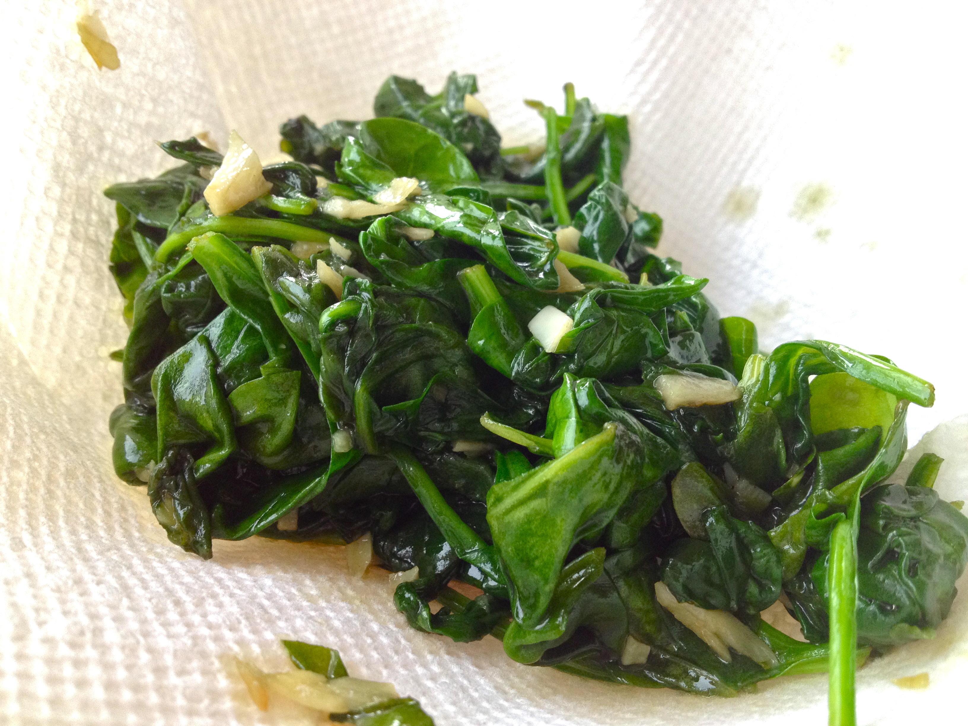 When it’s cool enough to touch, squeeze as much liquid as you can out of the spinach. I usually start with my hands and then realize that I can get more liquid out if I squeeze it between two dishes. Once you’re satisfied that you’ve gotten enough water out, set aside.