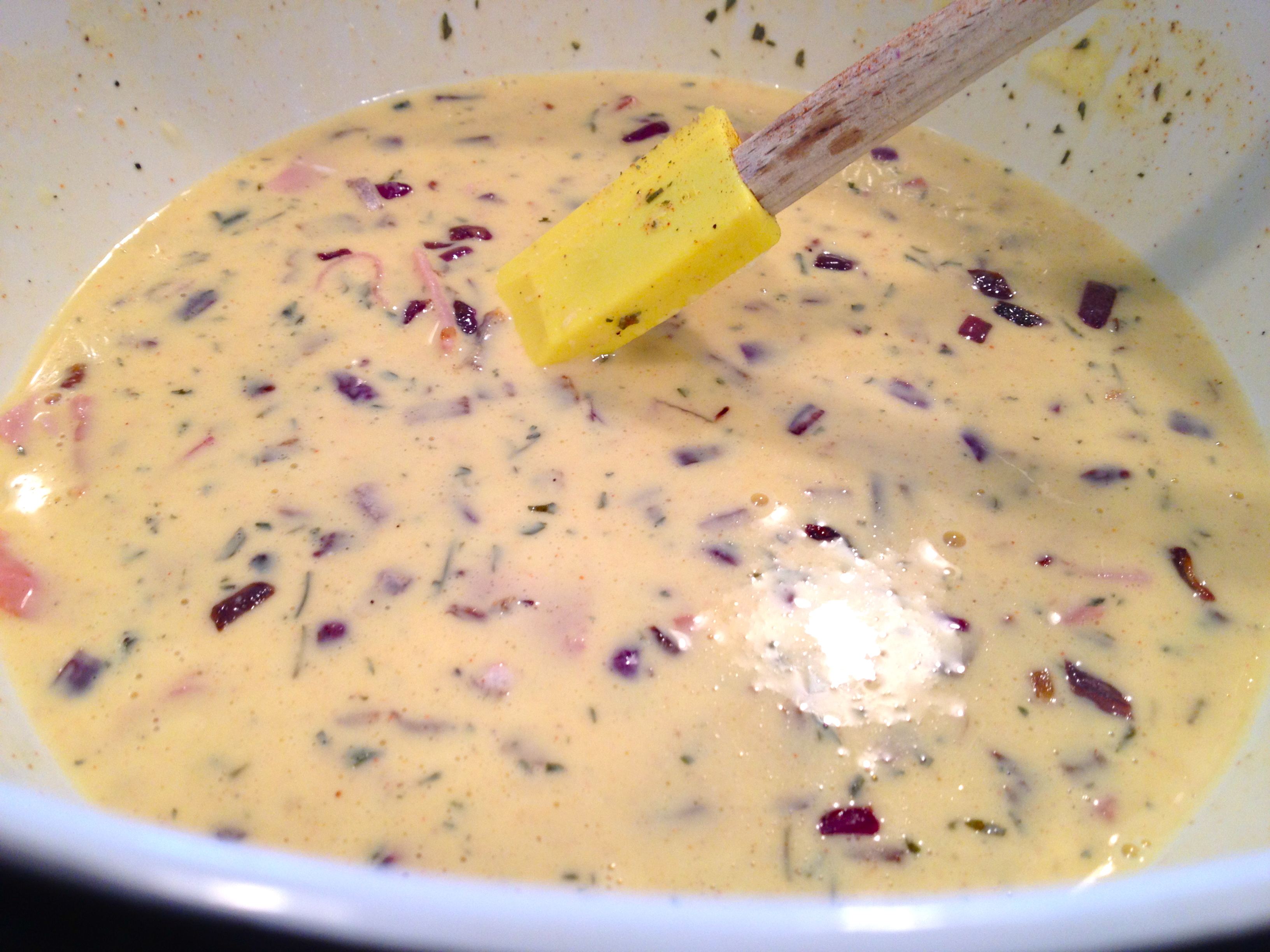 While the shell bakes, mix up the liquid part of the filling. Whisk together the yolks, egg, yogurt, and stock. Add parsley, paprika, mustard powder, and salt and pepper to taste. Stir in the onions and ham, and set aside.