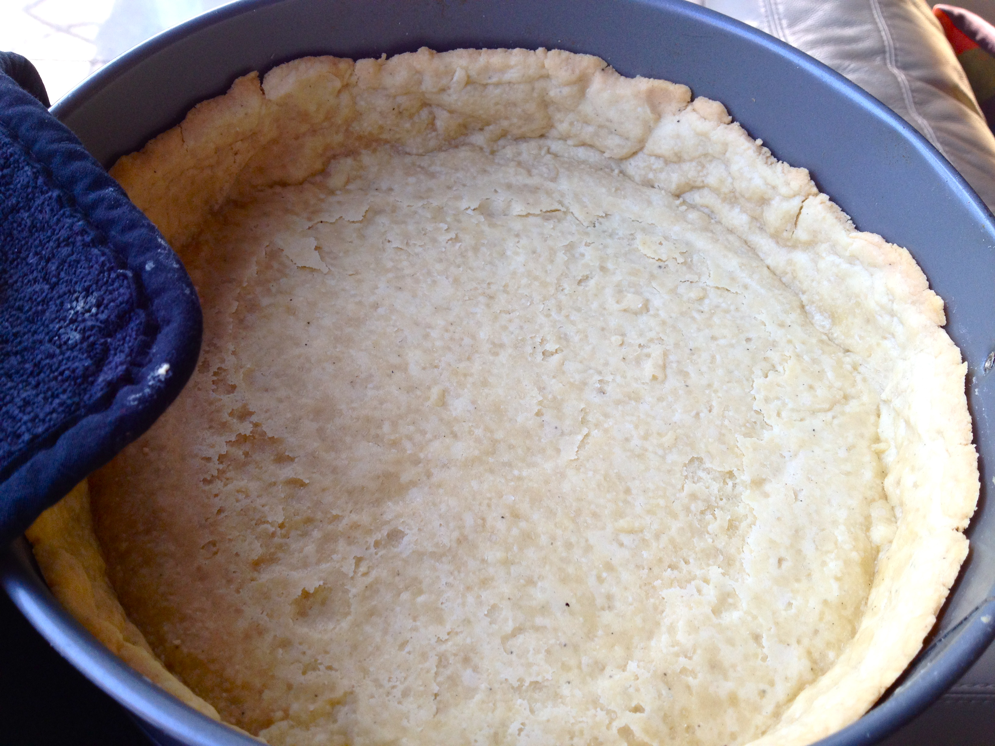 Bake the crust for 20 minutes, until just starting to turn golden. Remove from oven and remove the beans and parchment paper.