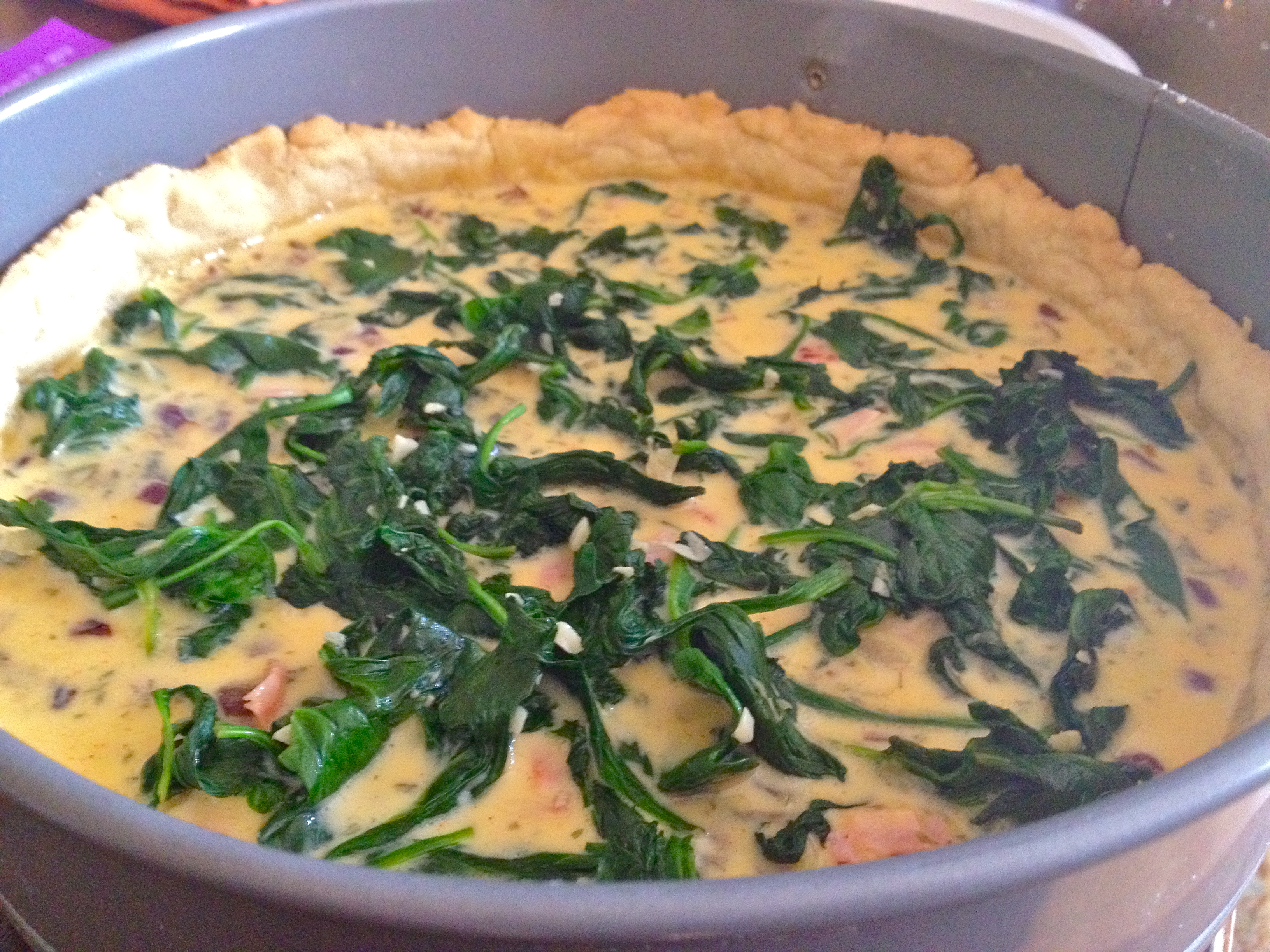 Pour the filling into the baked shell. Scatter the spinach evenly over the top.