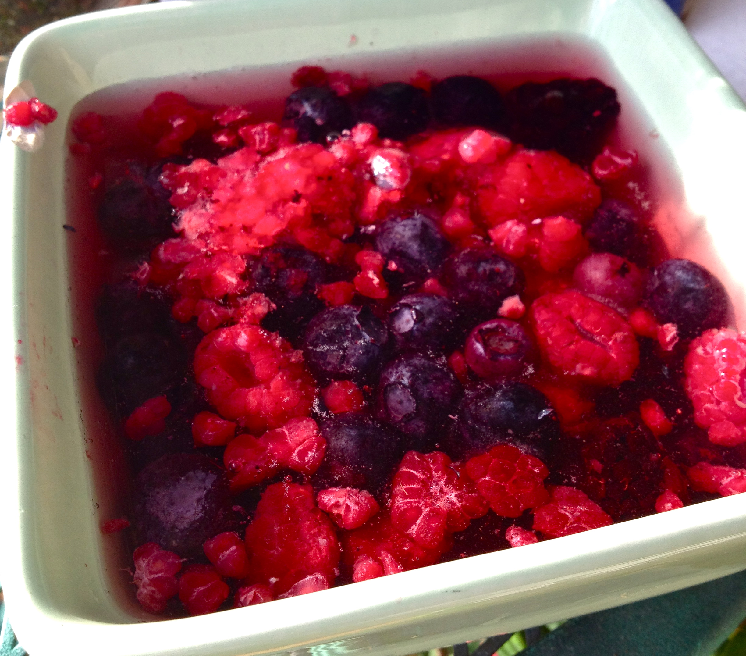 To make the berry filling, put the frozen berries in a bowl with warm water to thaw out. I usually change the water once, just to move the thawing along a little faster.