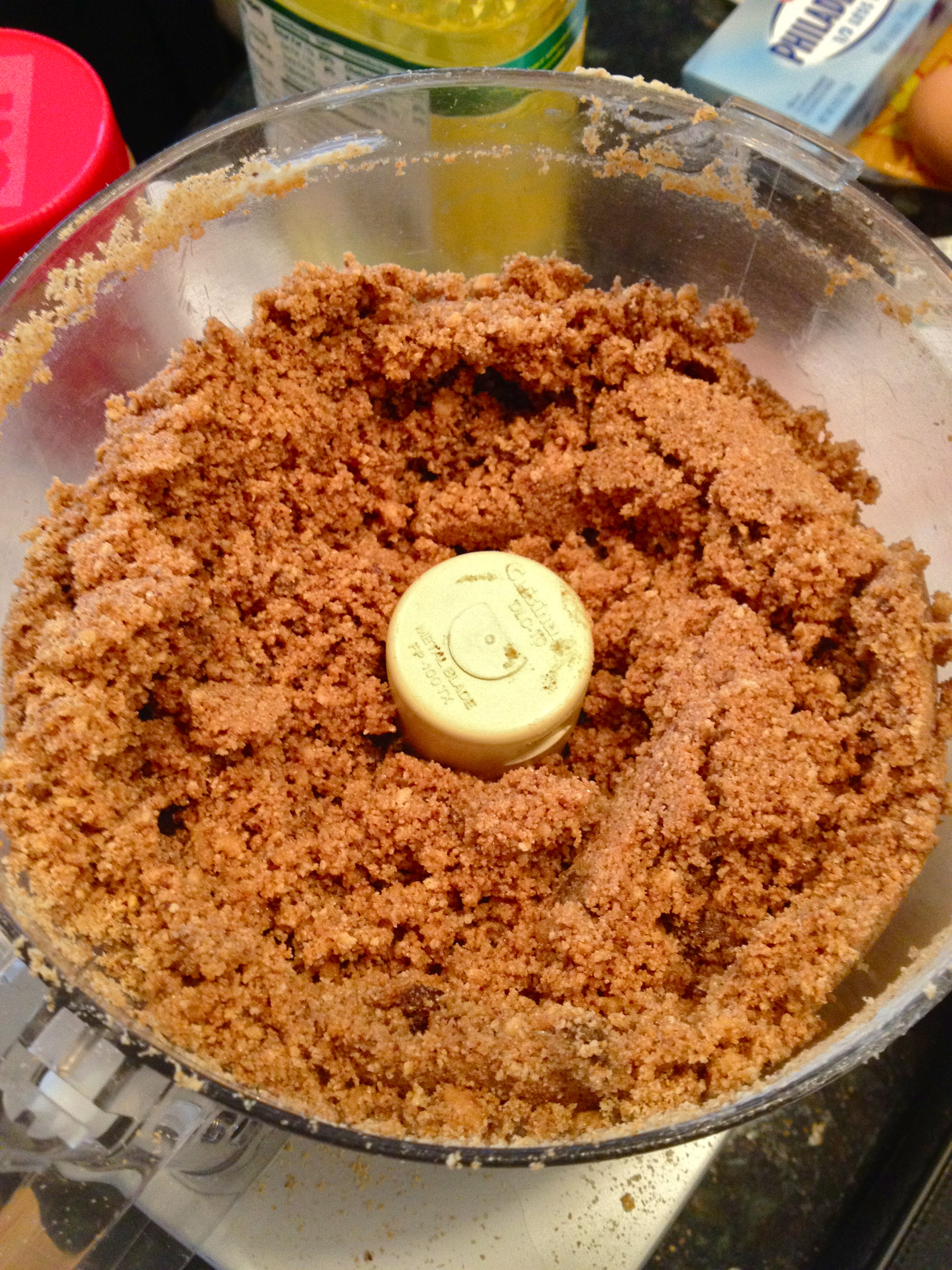 Next, the crust. In all honesty, crust is my favorite part of any cheesecake, and this one is awesome. One thing I didn’t do, but I think I will next time, is to start by pulverizing the chocolate chips in the food processor, so that they’ve broken up before the rest of the ingredients are added. This time, I added all the crust ingredients at once and pulsed until they came together, drizzling in just enough of the vegetable oil until the crust started to hold together. There were some chunks of chocolate left un-blitzed, so next time I’ll blitz the chocolate separately first.