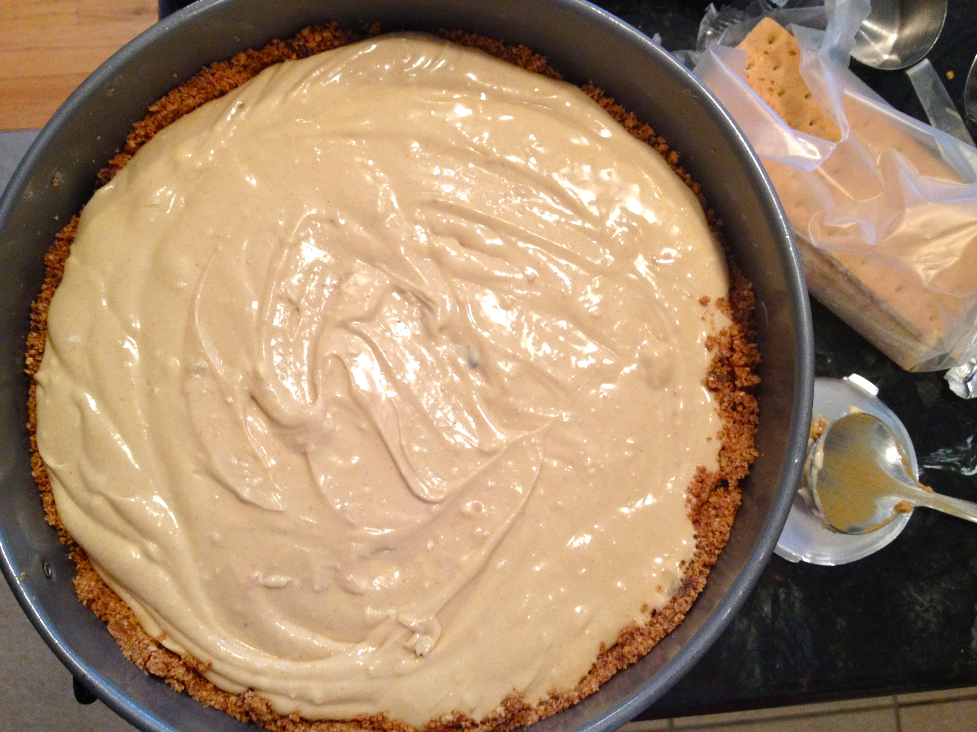 Pour filling into the graham cracker shell. Spread it gently into all the “corners ” (can circles have corners?), careful not to mess with the tenuous architecture of the crust.