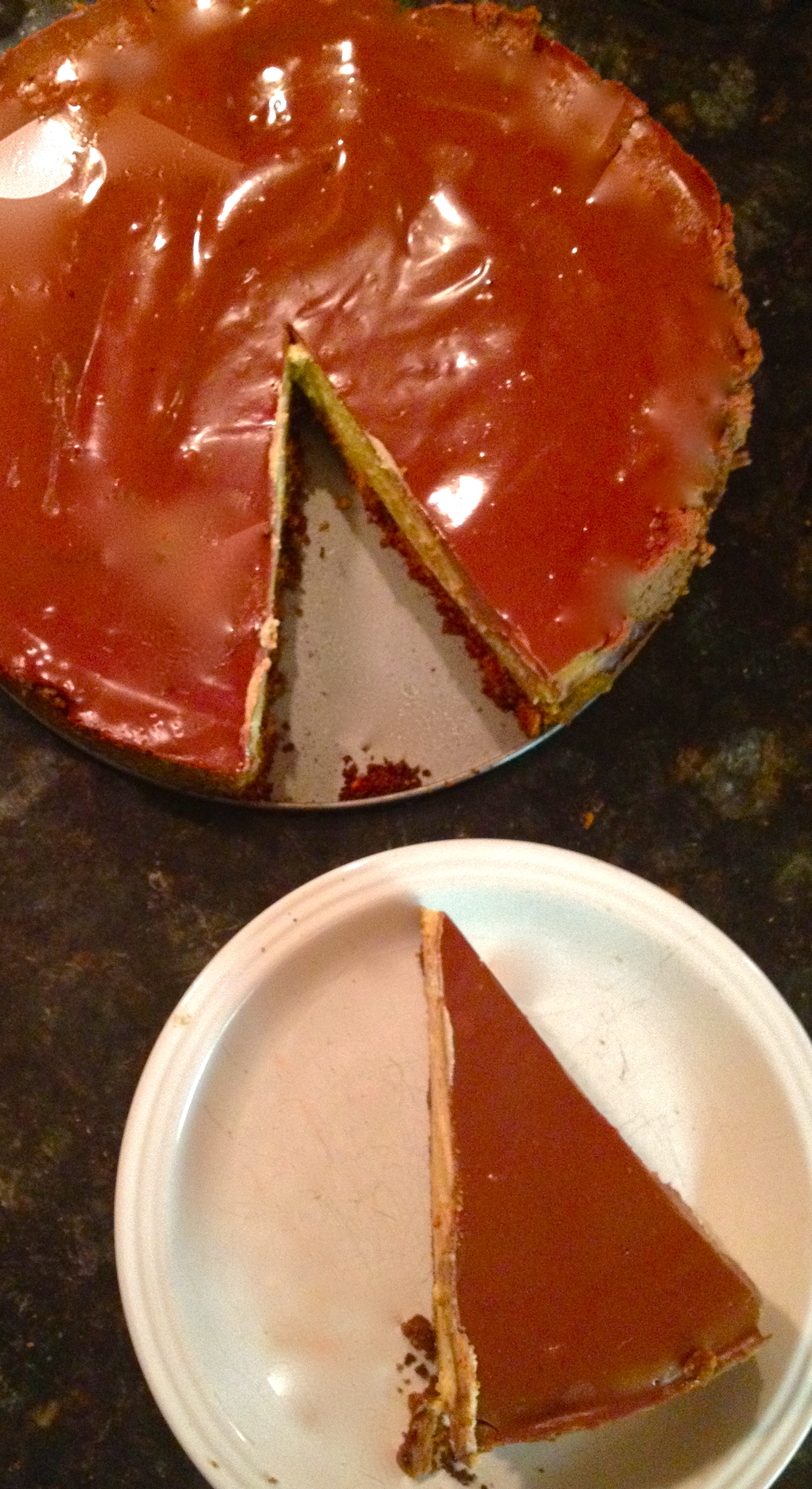 Take it out of the oven and pop it right into the fridge to chill overnight, cake pan and all (careful when you take it out of the pan though, as the chocolate topping is prone to stick to the sides). To be honest, I made this cheesecake to give to friends, so all it got was a quick chill in the freezer for an hour and then another hour or so in the fridge until we ate it. So the overnight chilling time isn’t mandatory, but it is nice.