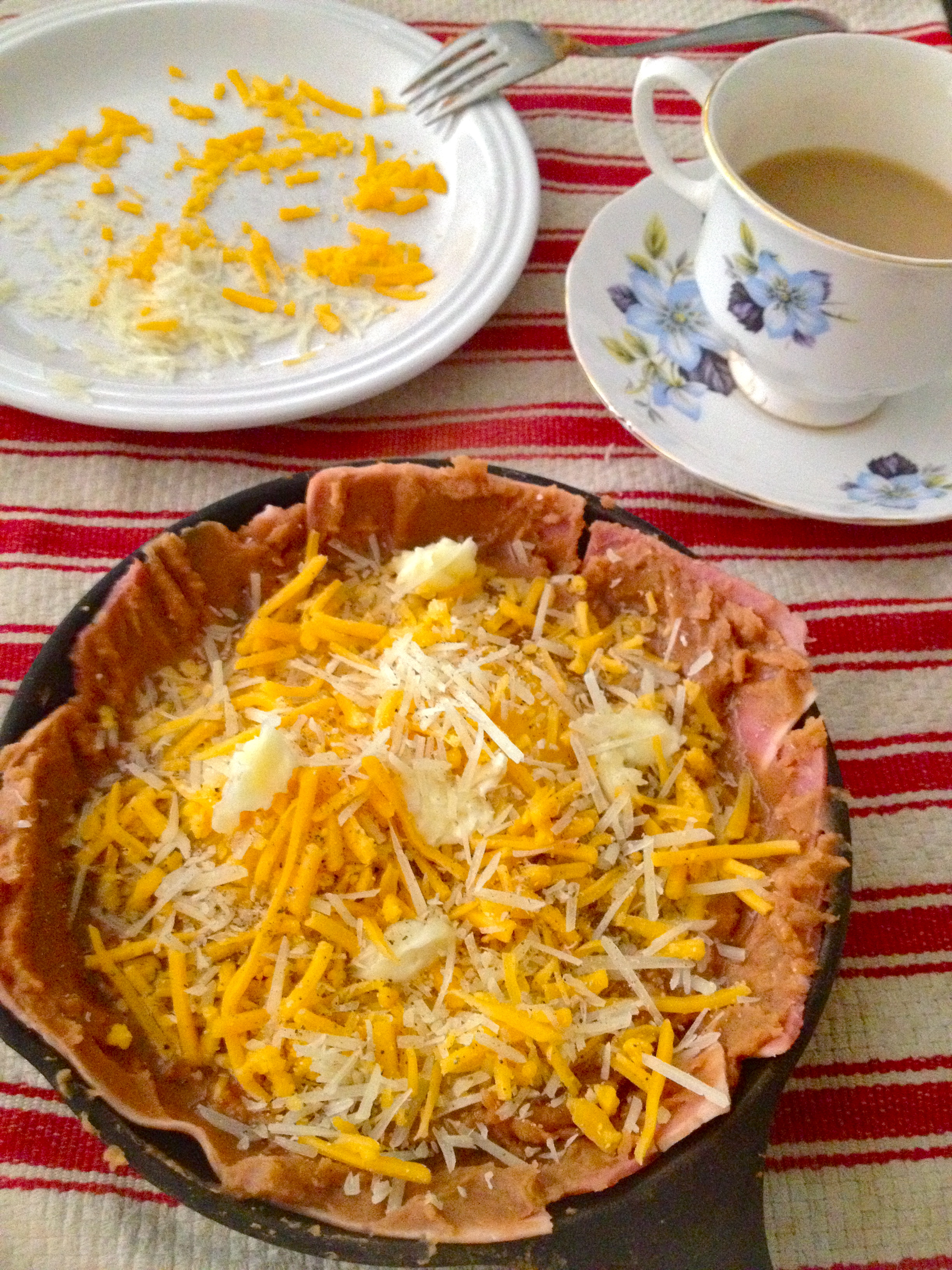 1/4 cup refried beans (or, again, however much it takes to spread in the dish)