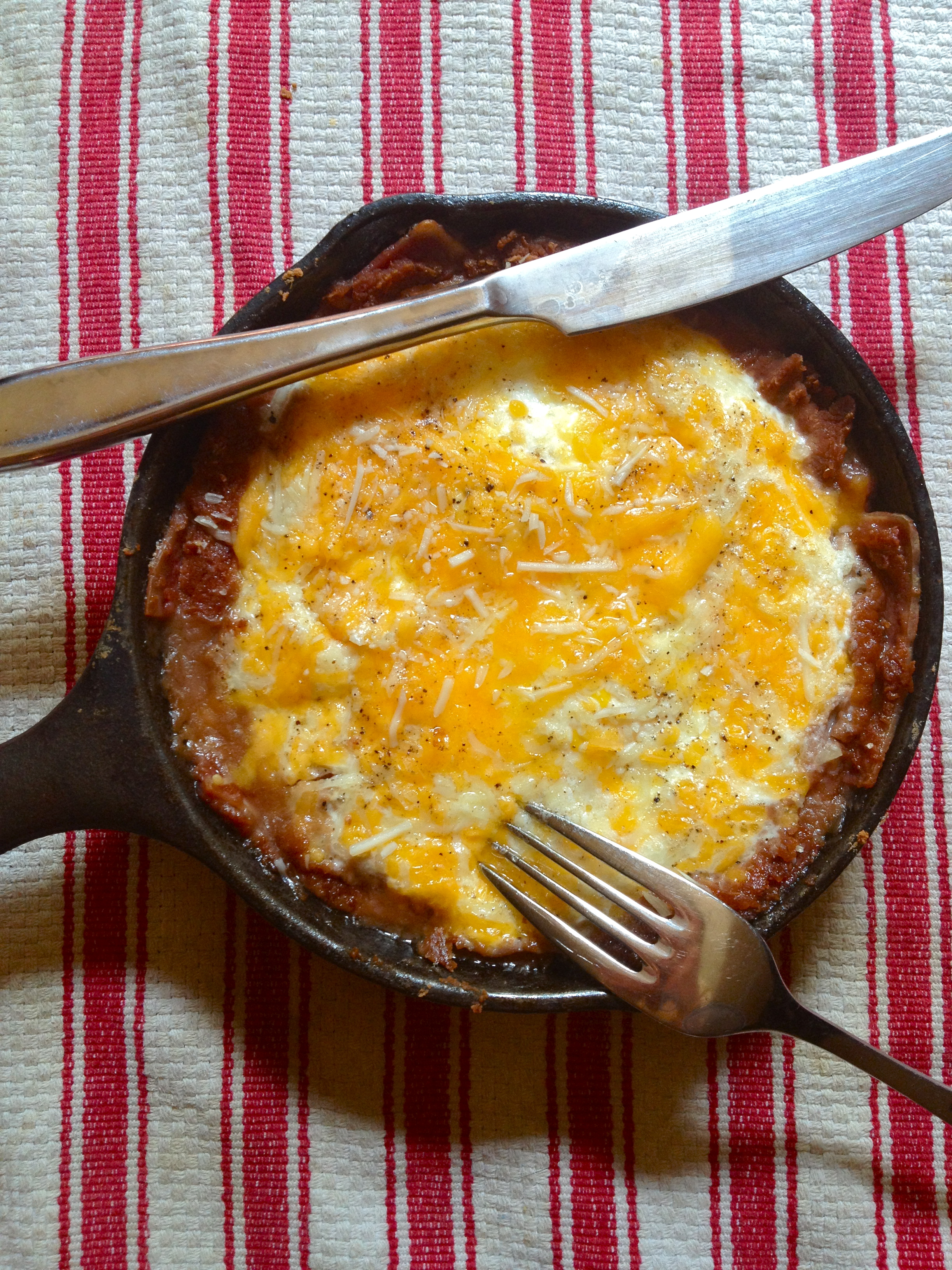*A note about bacon: Cook your bacon halfway before you use it in the recipe. I didn’t pre-cook mine, and when the whole thing was done, the bacon was just barely cooked. Still delicious, but it would have been even better if I had given it a few minutes on the stove or in the microwave. It just won’t get the cooking love it needs when it’s covered up by the beans and eggs. Do yourself a favor and pre-cook it.*