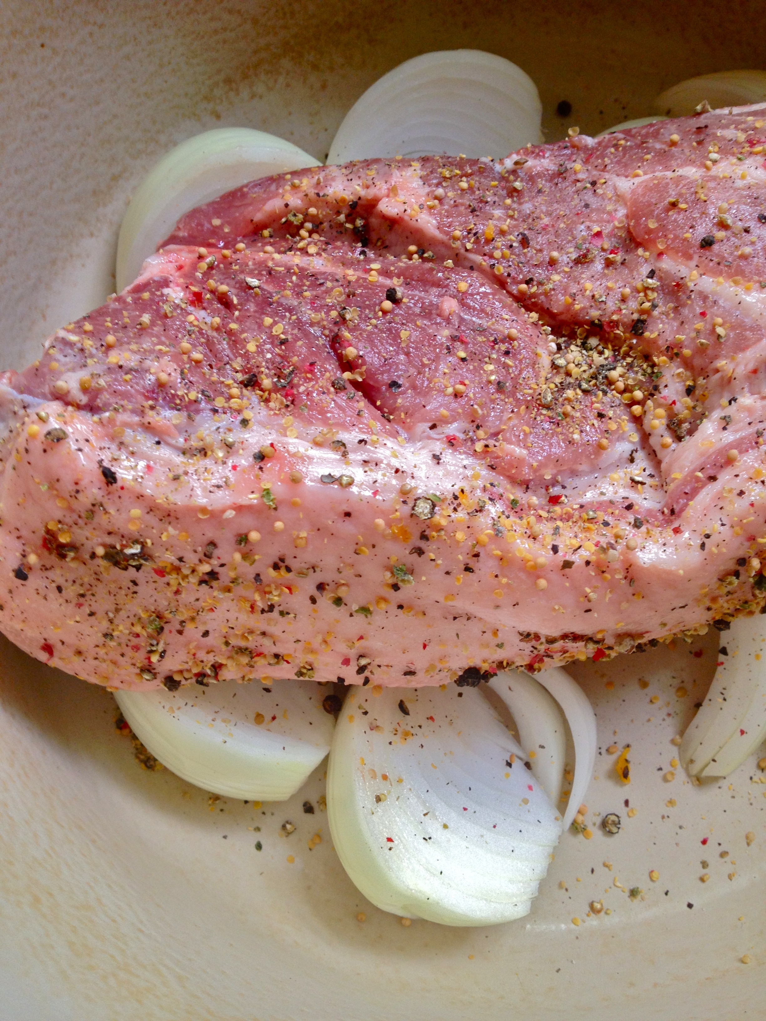 Sprinkle your pepper and ground mustard over the pork, and place the pork in the pot, on top of the onions.