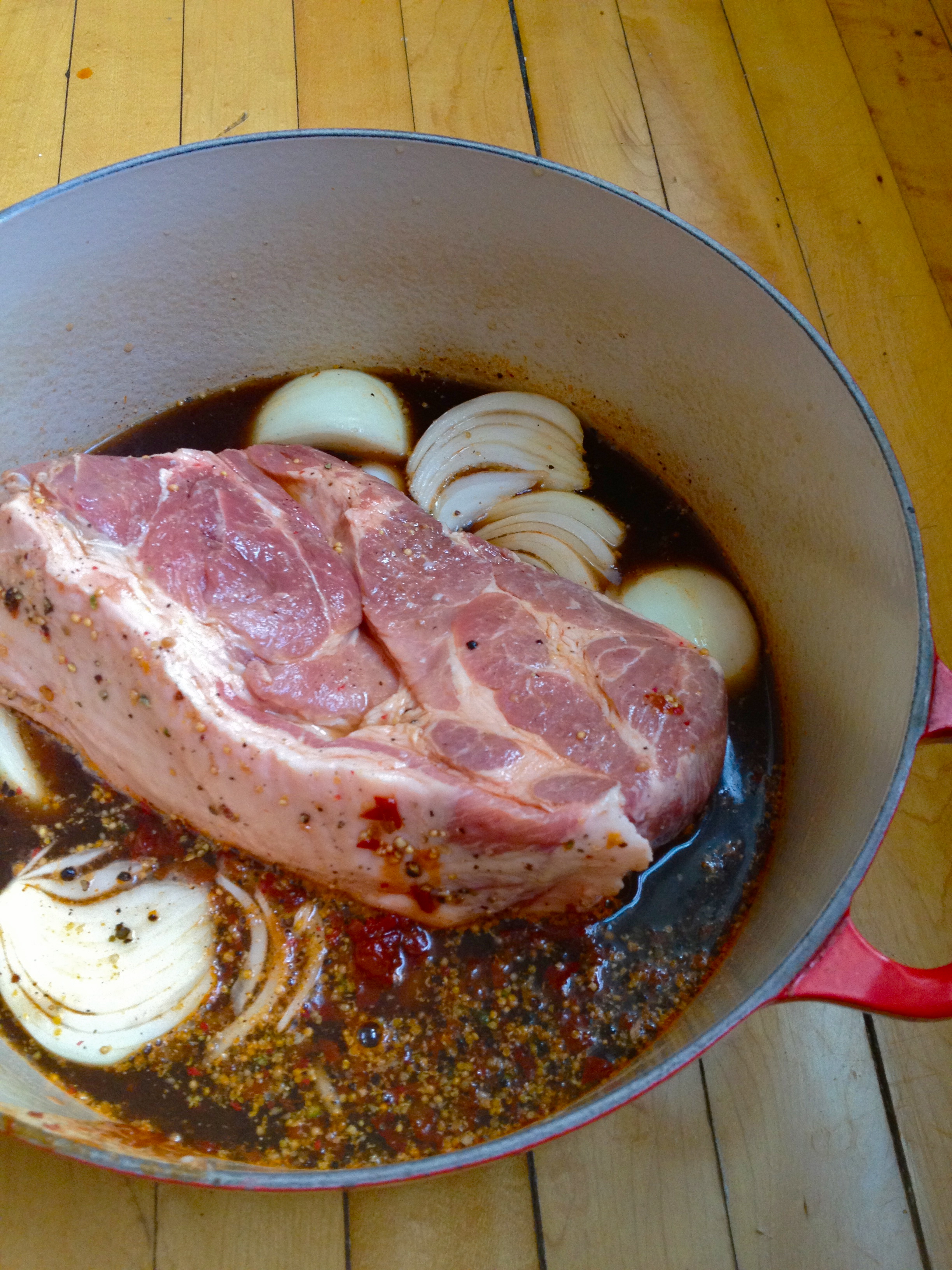 Cover the pot and put it in the oven for at least 3 hours (I cooked mine for just over 4 hours). Flip the pork over once during cooking.