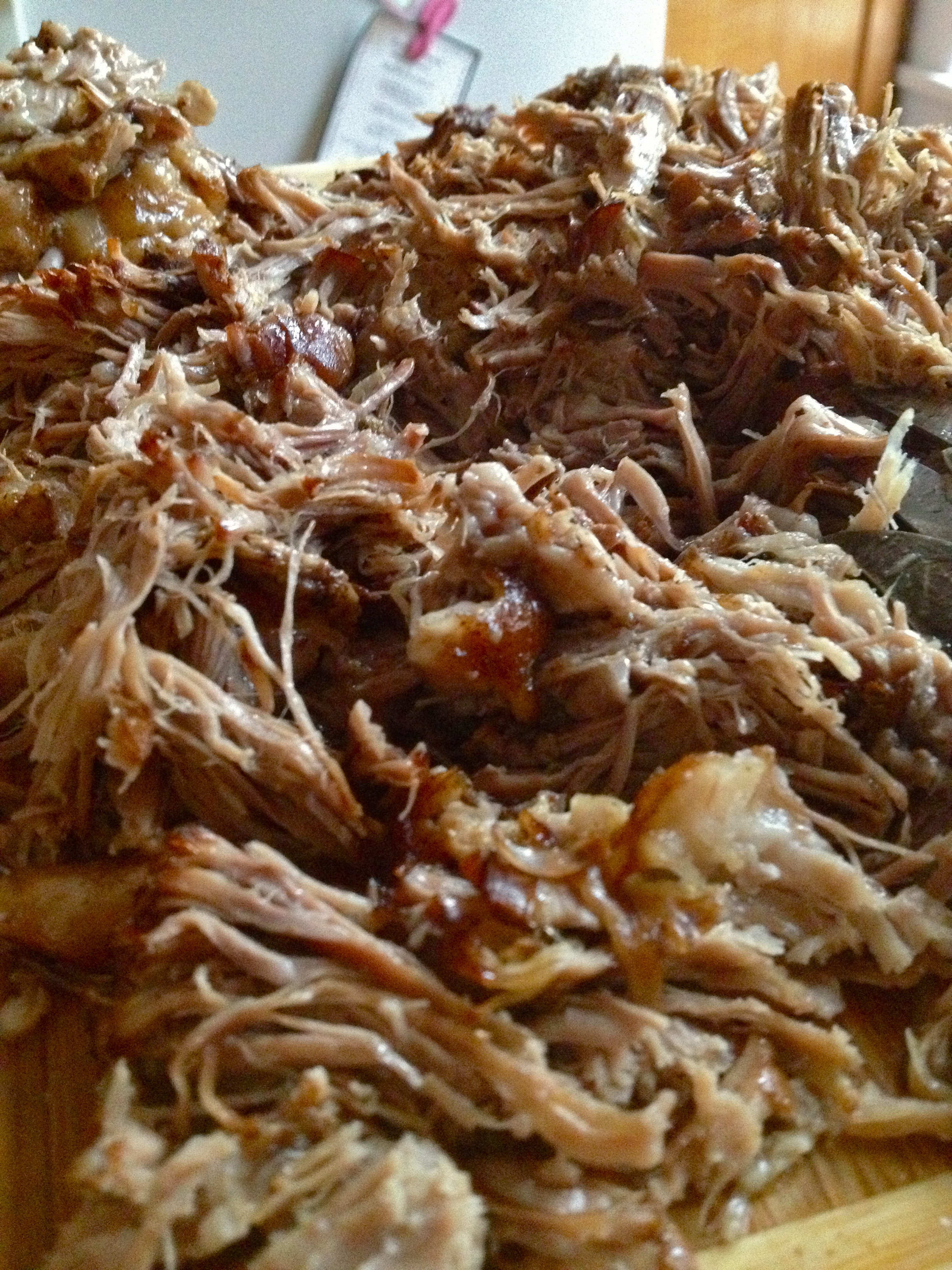 You know you’re there when you can easily shred the pork using two forks. At this point, remove the pork from the pot and shred it completely. Discard the bone.