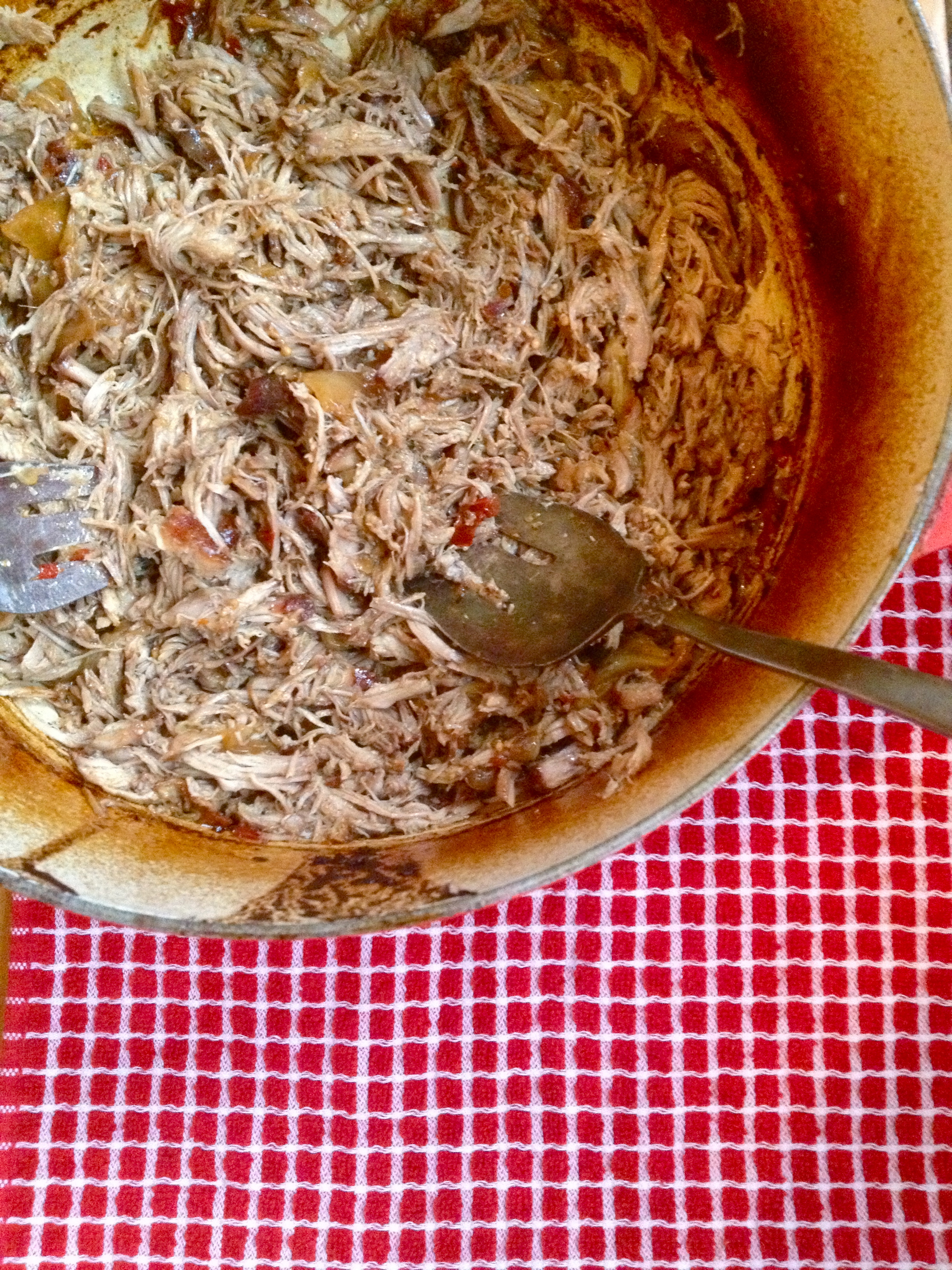 There should be just enough sauce left in the pot to coat the pork, so add the shredded meat back to the sauce and stir. That’s all!