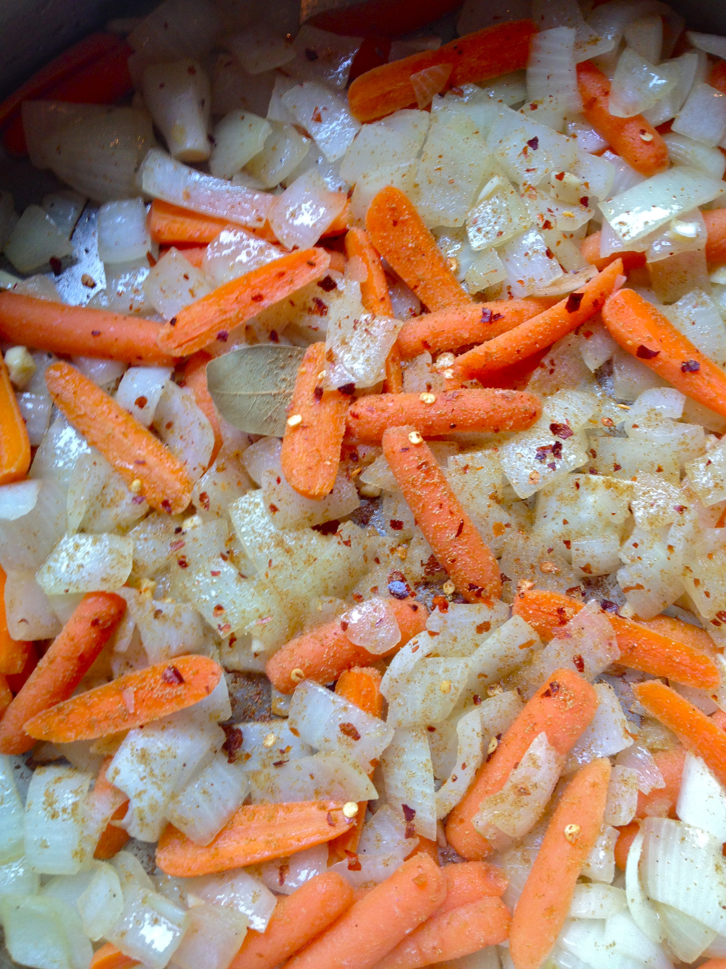 Turn the heat down to medium and add more oil to the pan if necessary. Toss in the carrots, onions, and garlic. Cook until softened, and then stir in the cumin, red pepper flakes, thyme, and bay leaf.