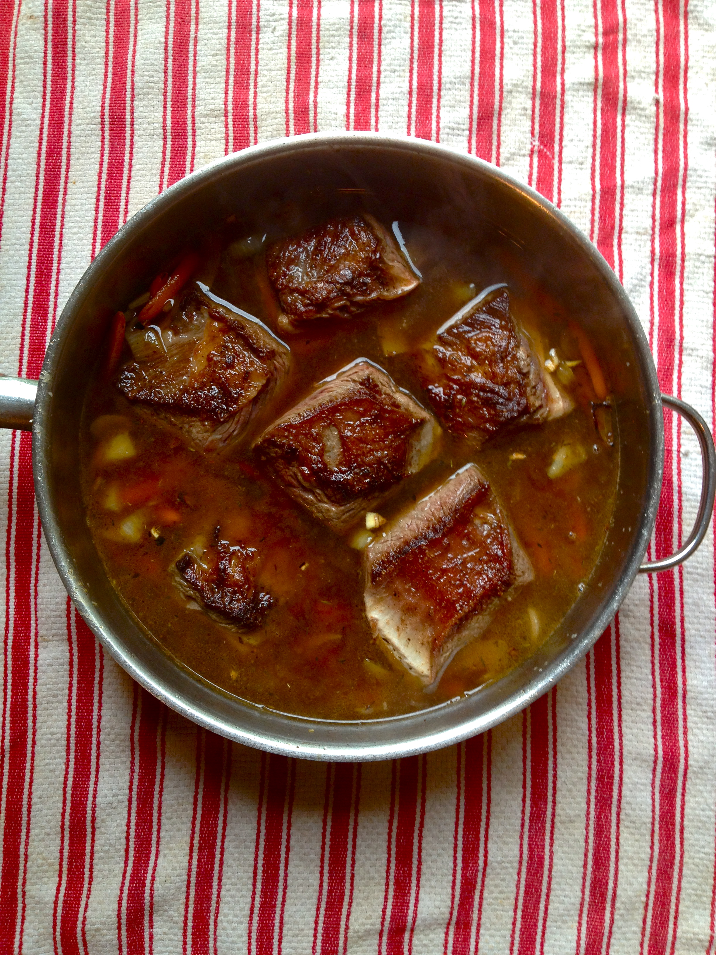 Cook until fragrant, and then pour in the Worcestershire sauce. Stir the veggies around as it steams, and then nestle the short ribs back into the pan. Pour in the stock and bring to a bubble. Taste for seasoning, and add salt as needed.