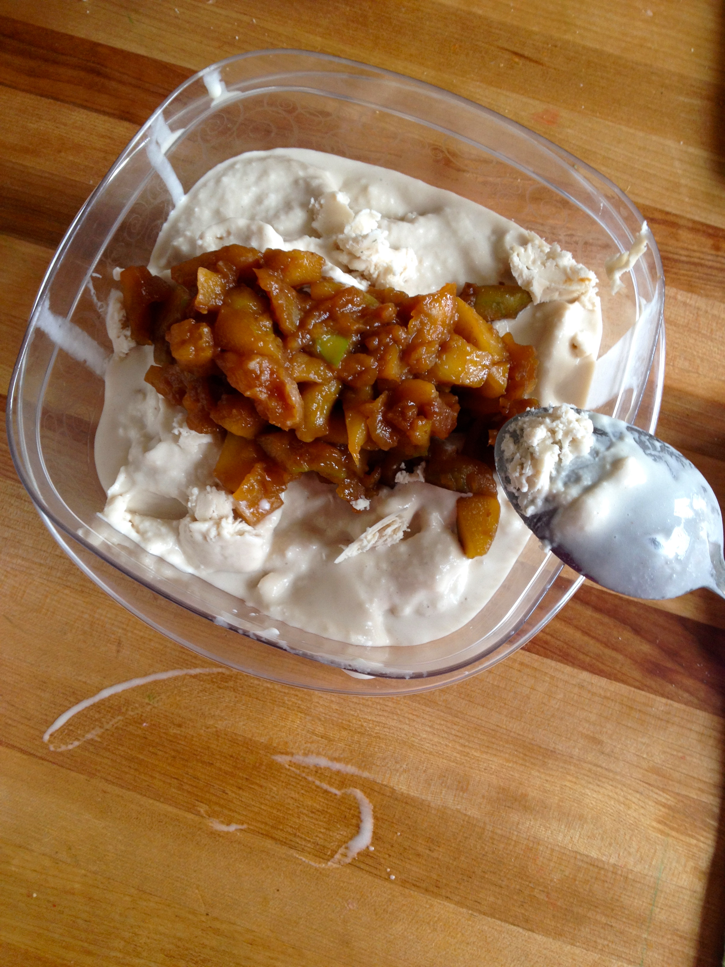 When the ice cream is churned, transfer to a container with a lid, stir in the apples, put the lid on the container, and freeze.
