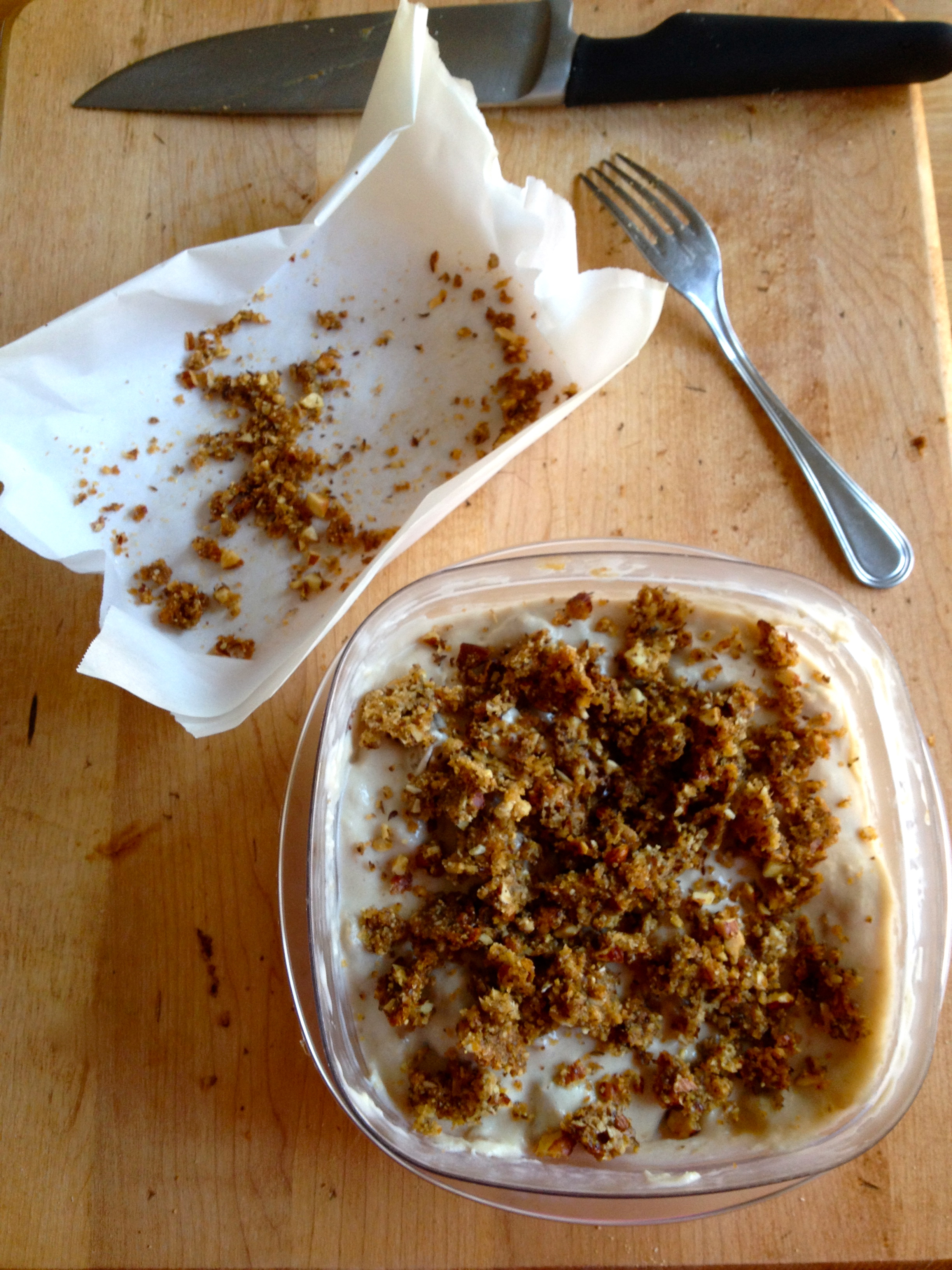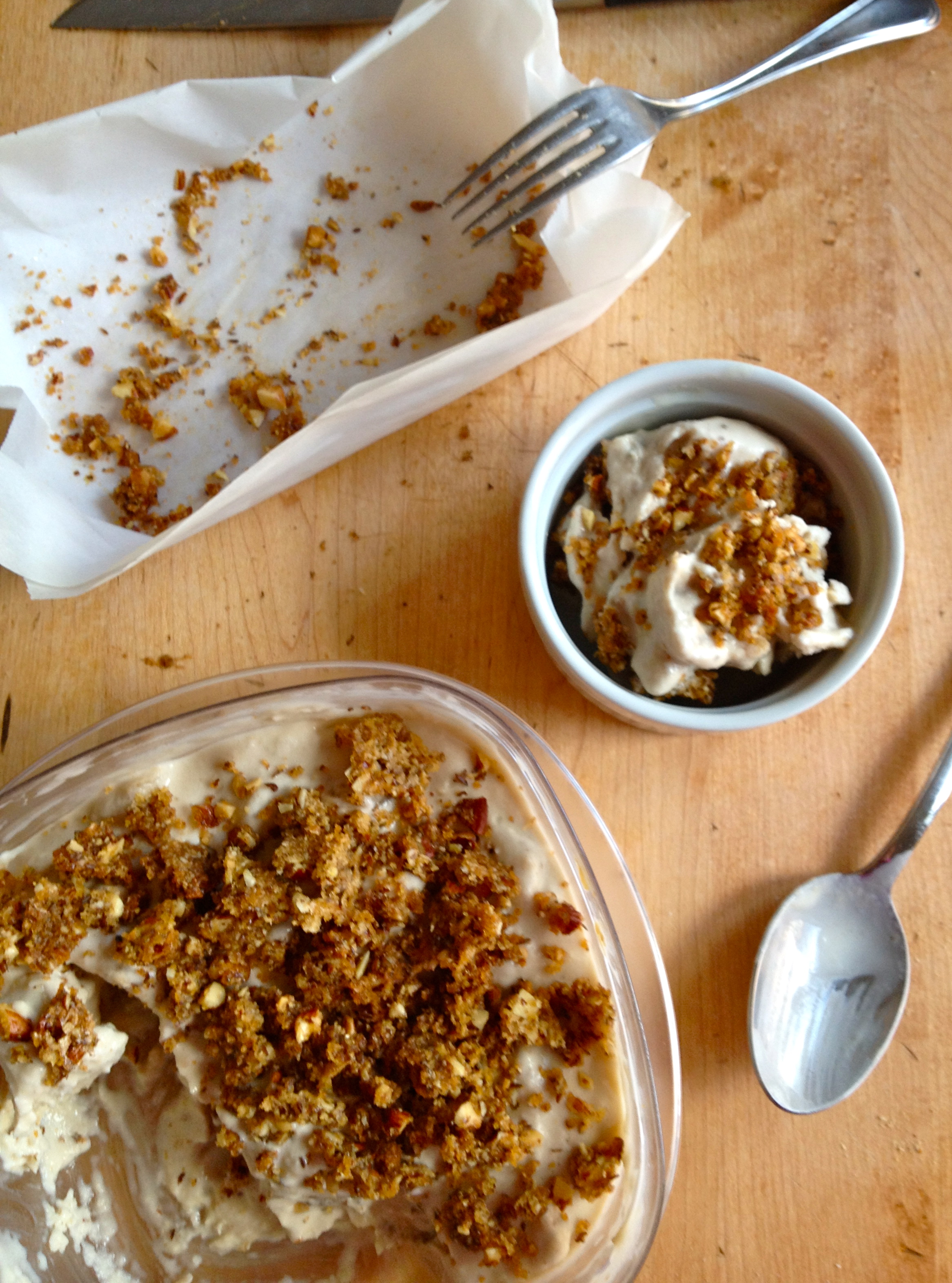 Mix together all remaining ingredients except the butter. Then use a fork to work the butter into the nut mixture. Line a baking dish with parchment paper and pour in the crumble, and bake for about 15 minutes, until golden brown. Refrigerate to cool.