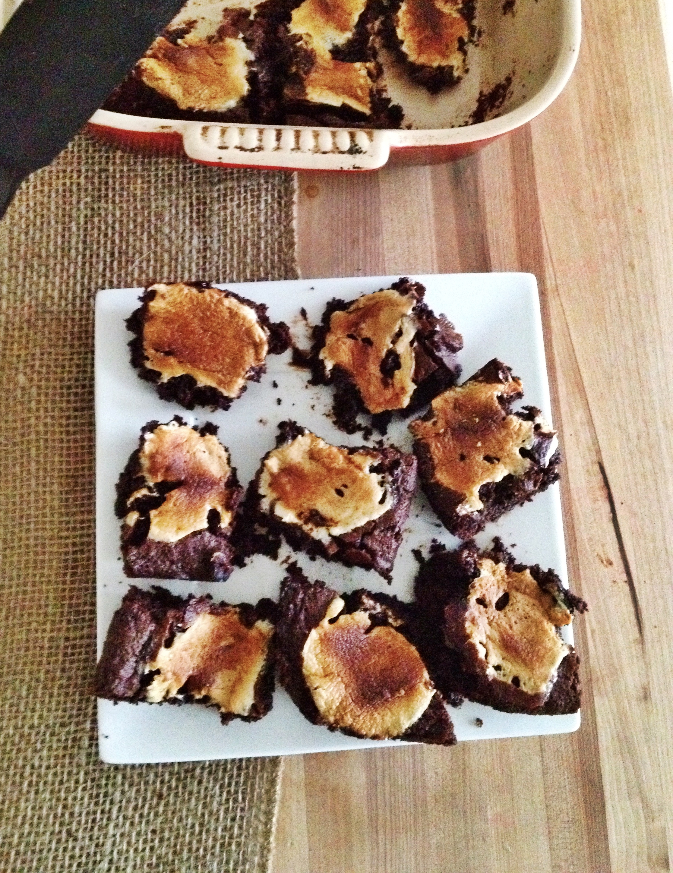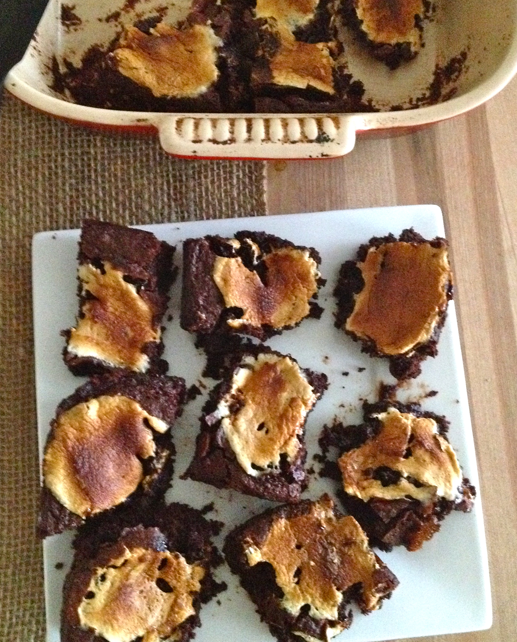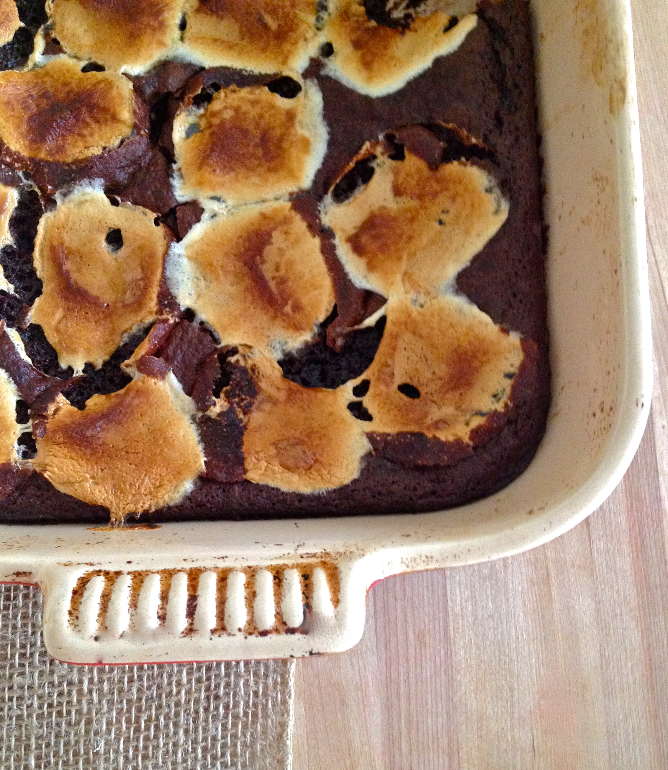 Bake for 25-30 minutes, until the center is set. If you stick a toothpick into the center, it doesn’t need to come out totally clean, but it shouldn’t be wet. Be conscious of the marshmallows burning; I ended up tenting a sheet of foil over the pan to slow the browning partway through the bake time. When the brownies are baked, remove them from the oven.