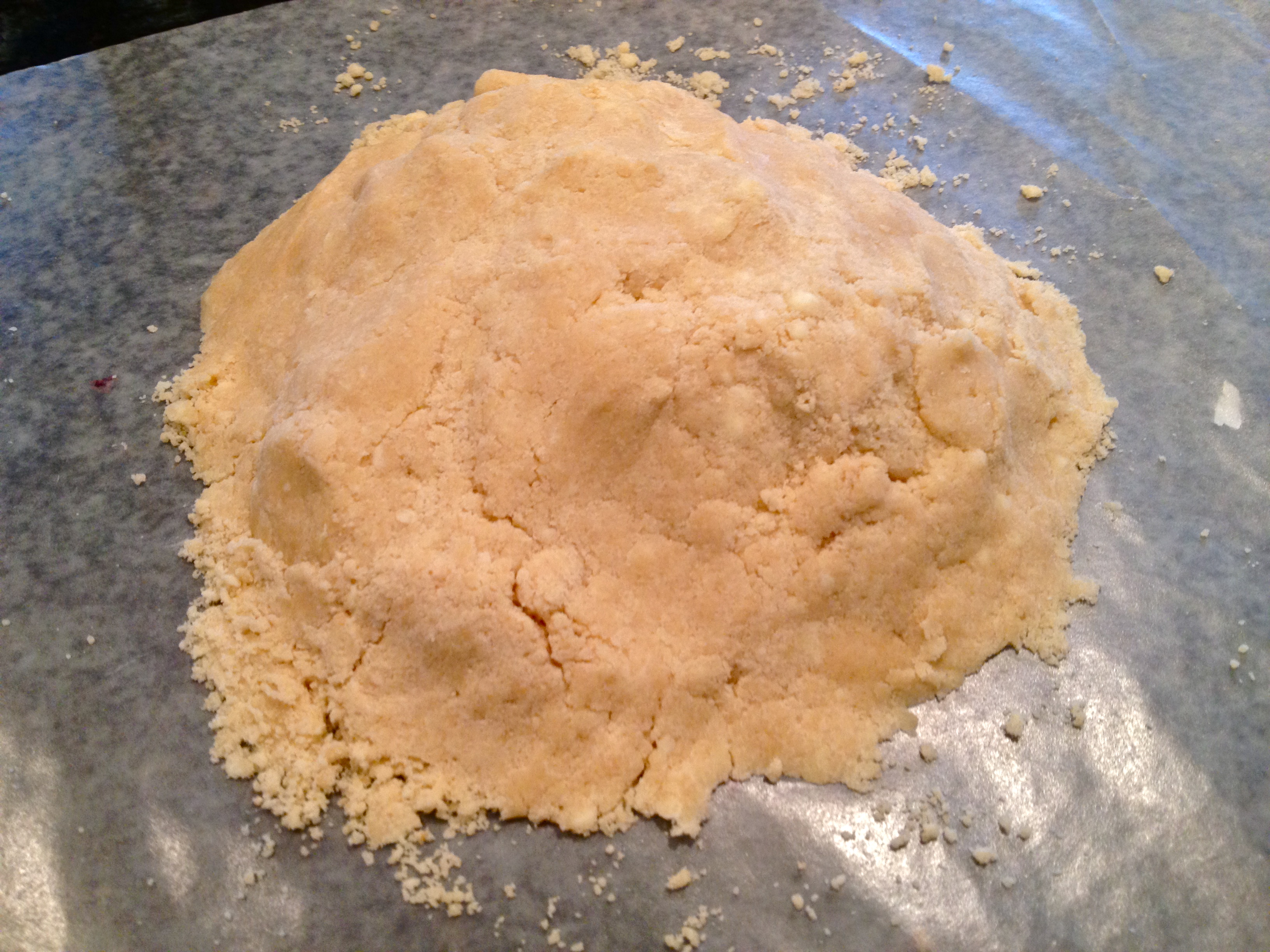 First, prepare the tart shell. In a food processor, pulse butter and sugar until just combined. Add the vanilla and pulse. Then combine the flour and salt in a bowl and add in two batches, pulsing until just combined. The dough should just hold together when pressed, so if it doesn’t at this point (mine didn’t), add a few drops of water and pulse until it reaches the right consistency. Turn the dough out onto wax paper and press into a disc. Wrap in paper and let it rest in the refrigerator at least half an hour.