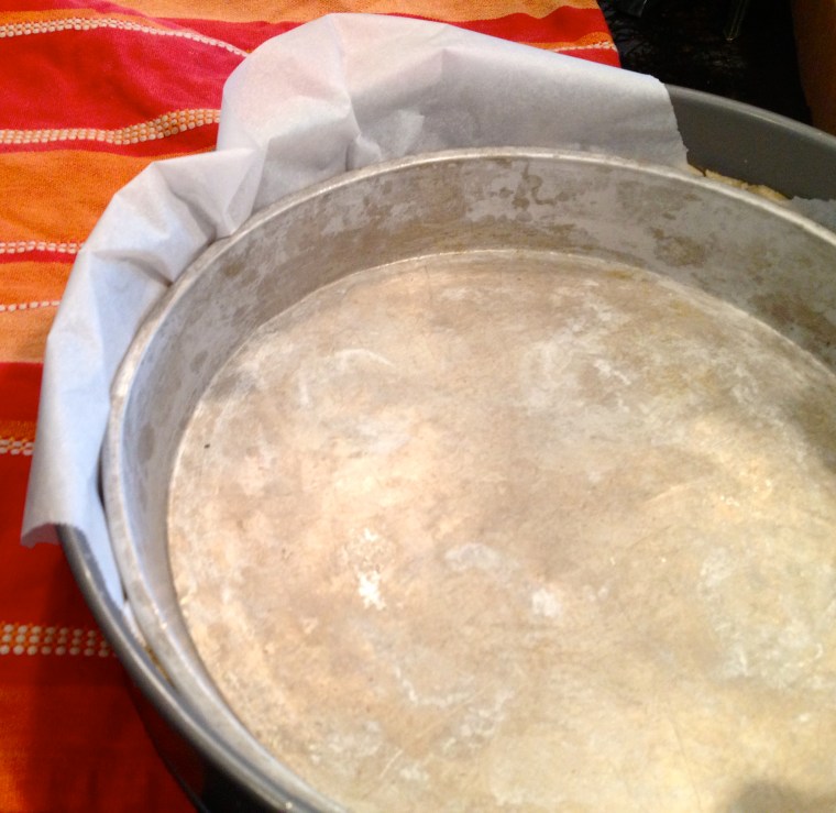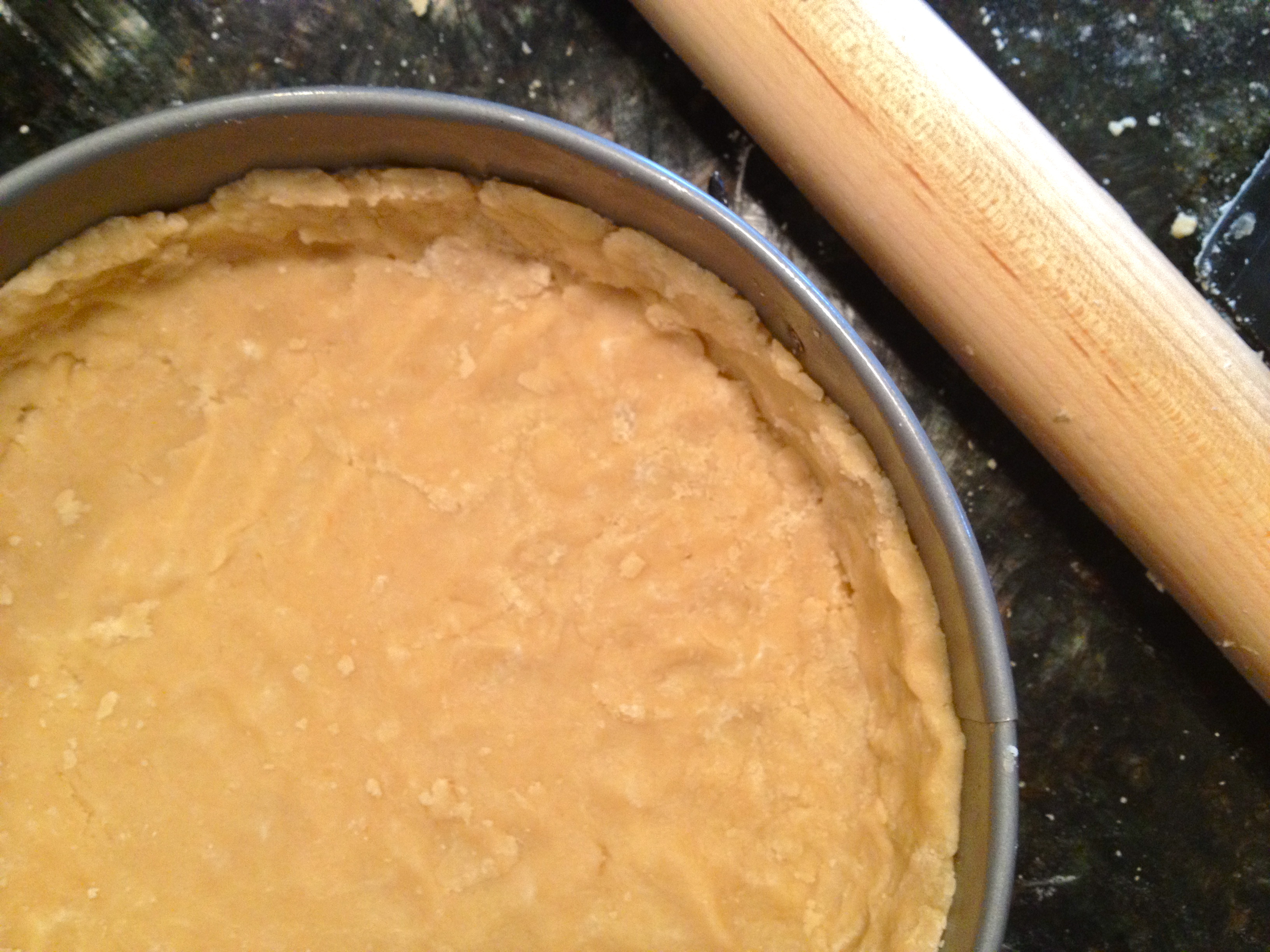 Take the cold dough and carefully roll it out to to the size of your greased tart tin or pie dish. Press the dough into the dish and up the sides. Put it back into the fridge for 30 minutes.