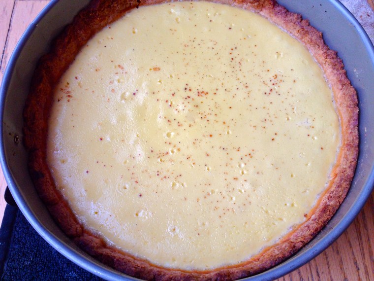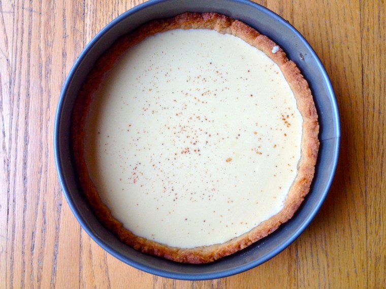 Pour the custard into the shell through a sieve so that it’s totally smooth. Sprinkle with a pinch of nutmeg.