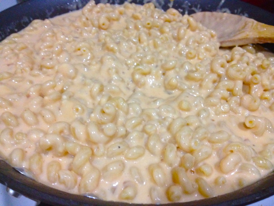 By this time, the sauce had thickened a little more than I wanted it to. To get it back to that gooey creamy sauciness, I added a bit of the pasta water that I had set aside earlier. When the sauce consistency is to your liking, stir in the pasta and coat it completely in beautiful cheesy goodness.