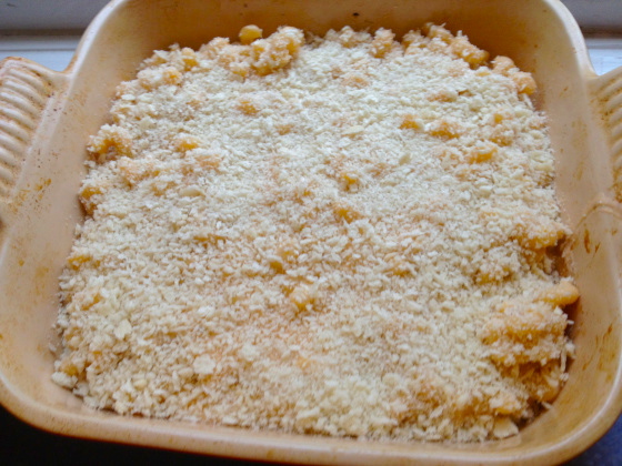 Pour the whole thing into a greased baking dish and spread it out evenly. Top with bread crumbs and drizzle with a bit of olive oil.